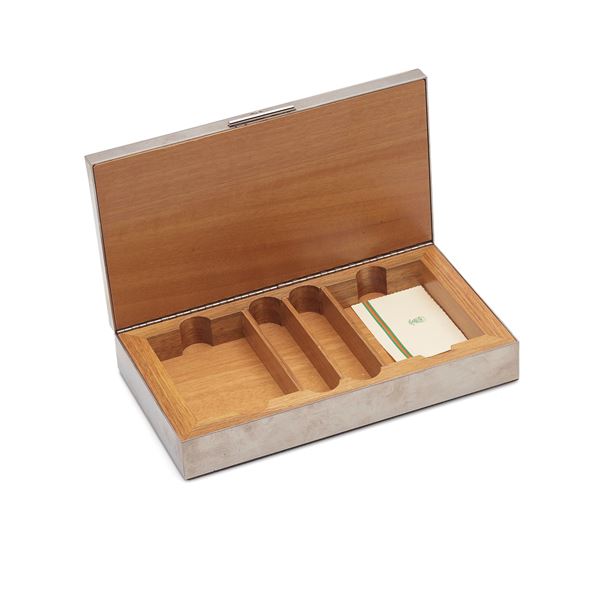 Scatola da gioco Gucci vintage in legno rivestito da metallo argentato, pelle di lucertola e camoscio sul retro. All'interno due scompartimenti per le carte e due per le fish. Nuovo,con cartellino originale.