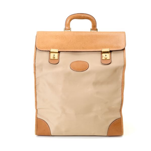 Borsone Gucci vintage richiudibile in cartella in pelle cognac e tela con metalleria dorata. Completa di targhetta e lucchetto. Discrete condizioni.