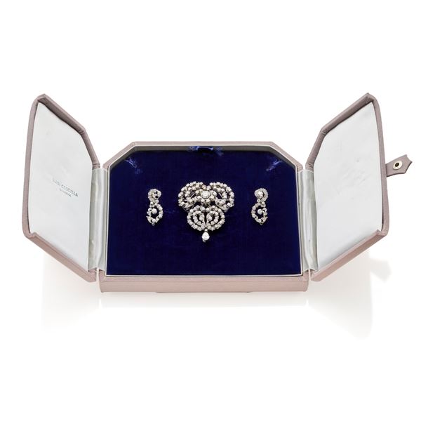 18 Kt white gold necklace convertible into brooch and earrings with a central round diamond weighing approx. 1,50 ct and pear-shaped diamond of approx. 1,10 ct, finished with round diamonds totalling approx. 6,60 ct. Within its original case by Codevilla Genova.