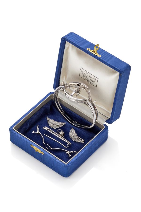 18 Kt white gold flower brooch with en tremblant corolla decorated with round diamonds totalling approx. 6,95 ct and round rubies, convertible into bangle and brooch. Within Chiappe Genova boxes.