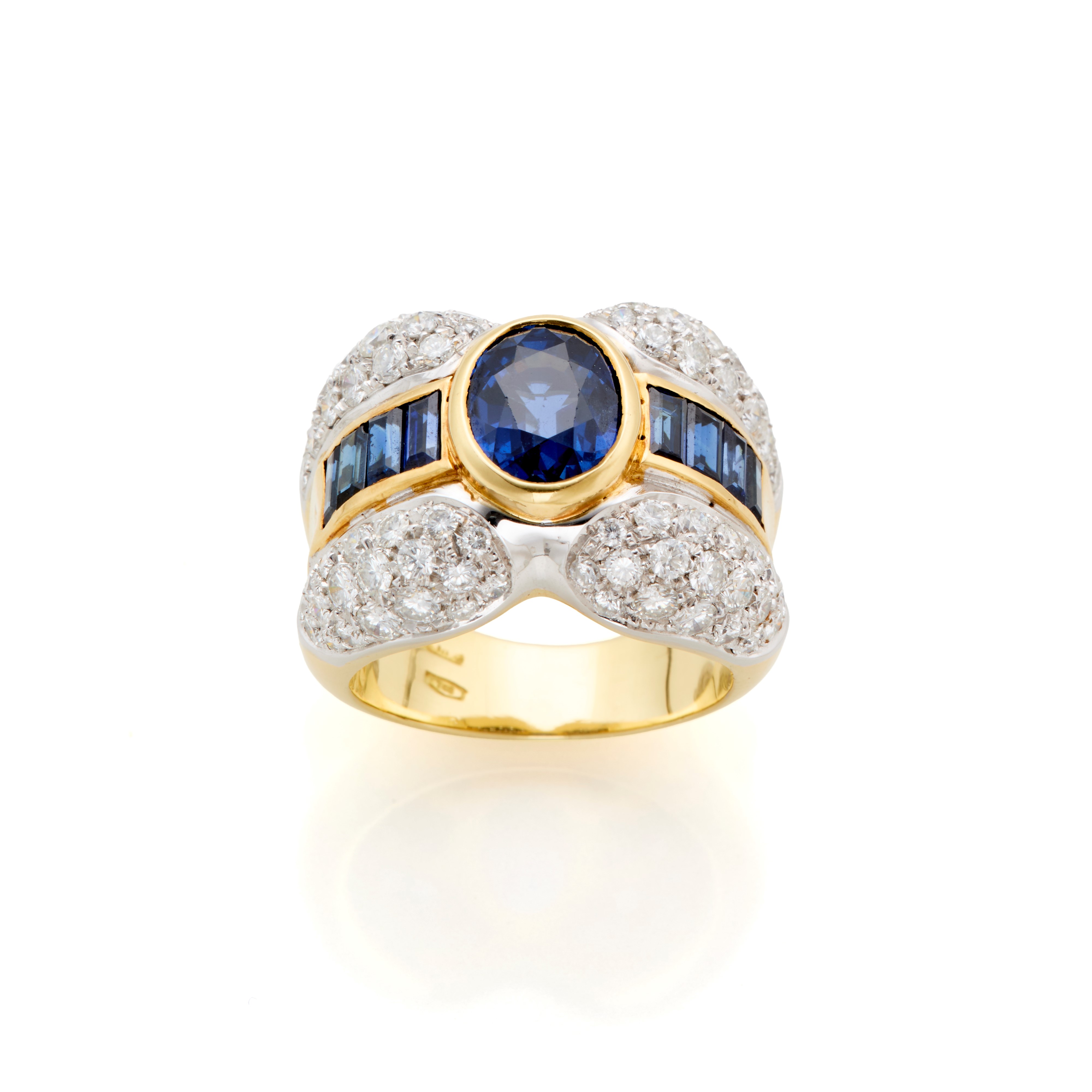 Missiaglia 18 Kt yellow and white gold ring with oval sapphire of approx. 2,80 ct, baguette sapphires totalling approx. 1,40 ct and round diamonds weighing approx. 2 ct.