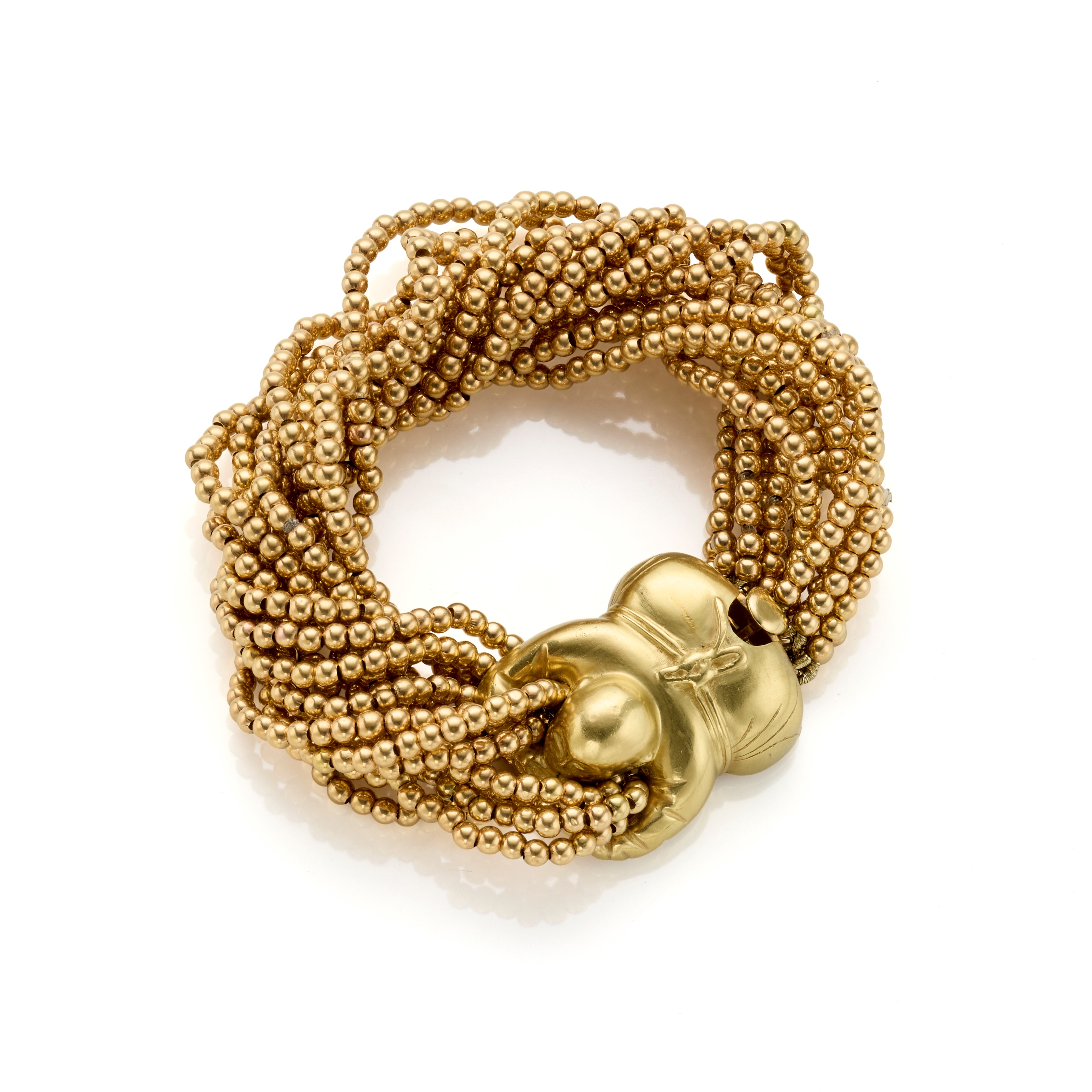 18 Kt yellow gold multi-strand bracelet with a Buddha clasp. Accompanied by Giuseppina Fermi jewellery certificate.