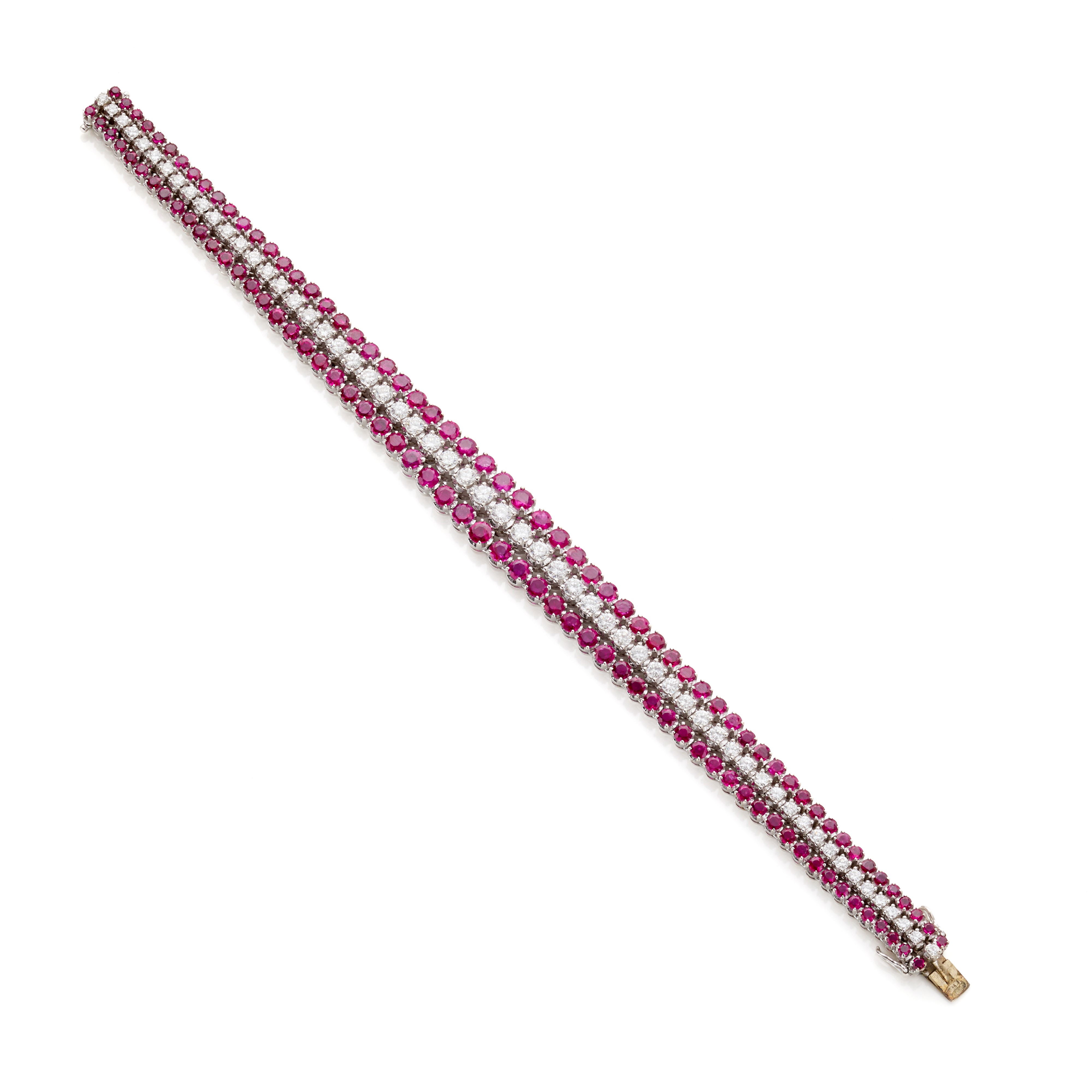 18 Kt white gold bracelet set with round diamonds totalling appox. 2,85 ct and round rubies totalling approx. 9,90 ct.