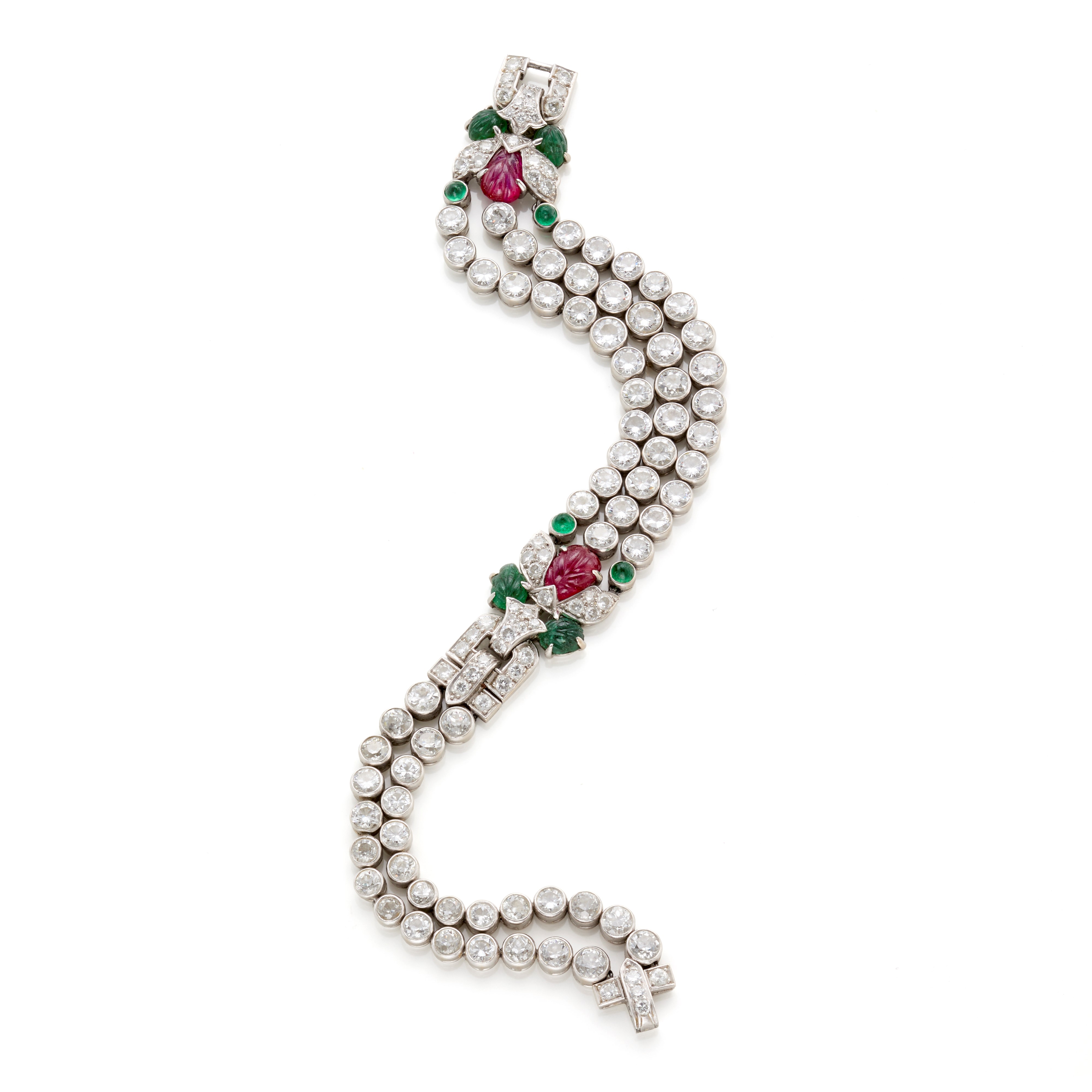 Bracciale in platino con diamanti rotondi per complessivi circa 13,50 ct rifinito con rubini e smeraldi cabochon intagliati.