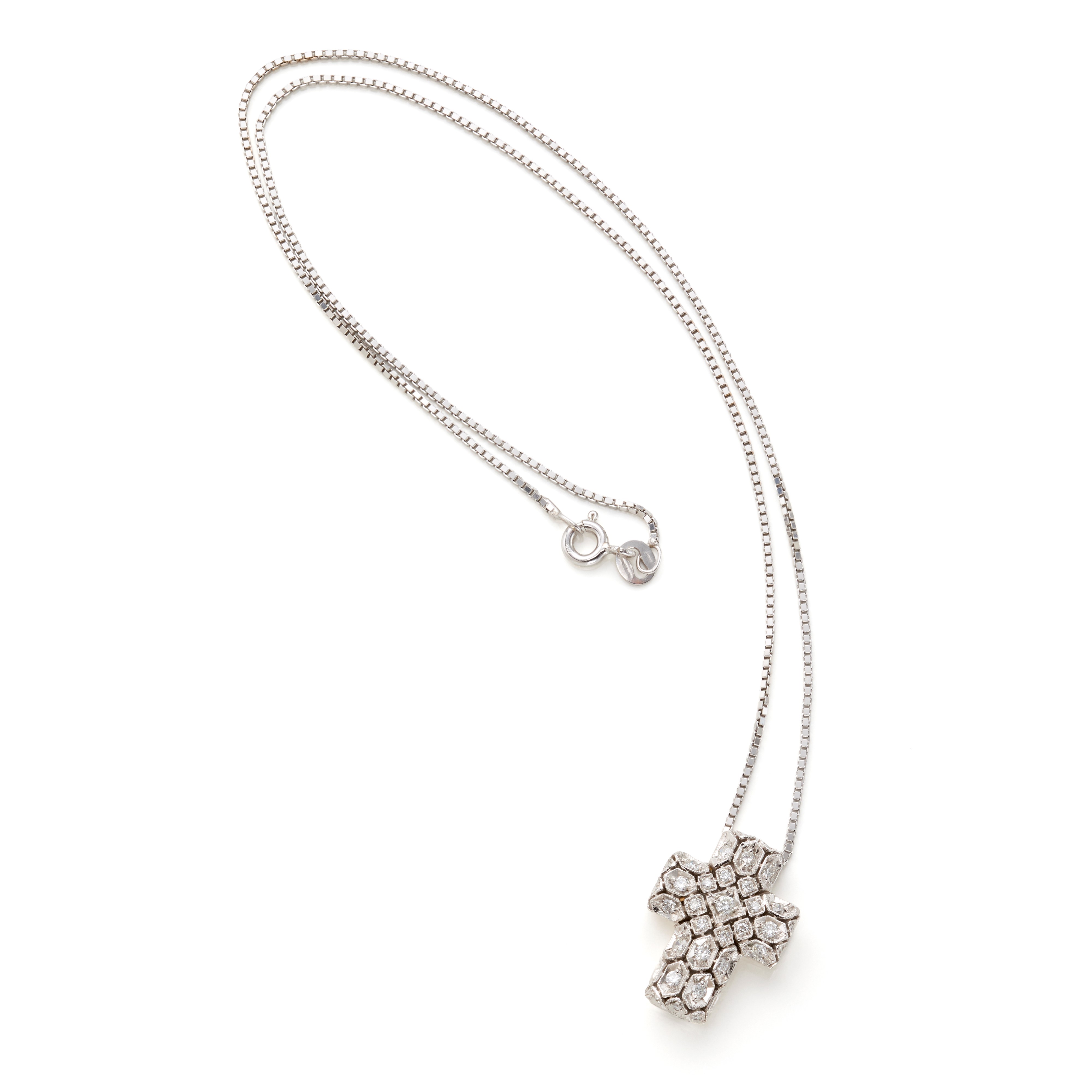 Catenina con pendente a croce in oro bianco 18 Kt rifiniti con diamanti rotondi per complessivi circa 0,60 ct.