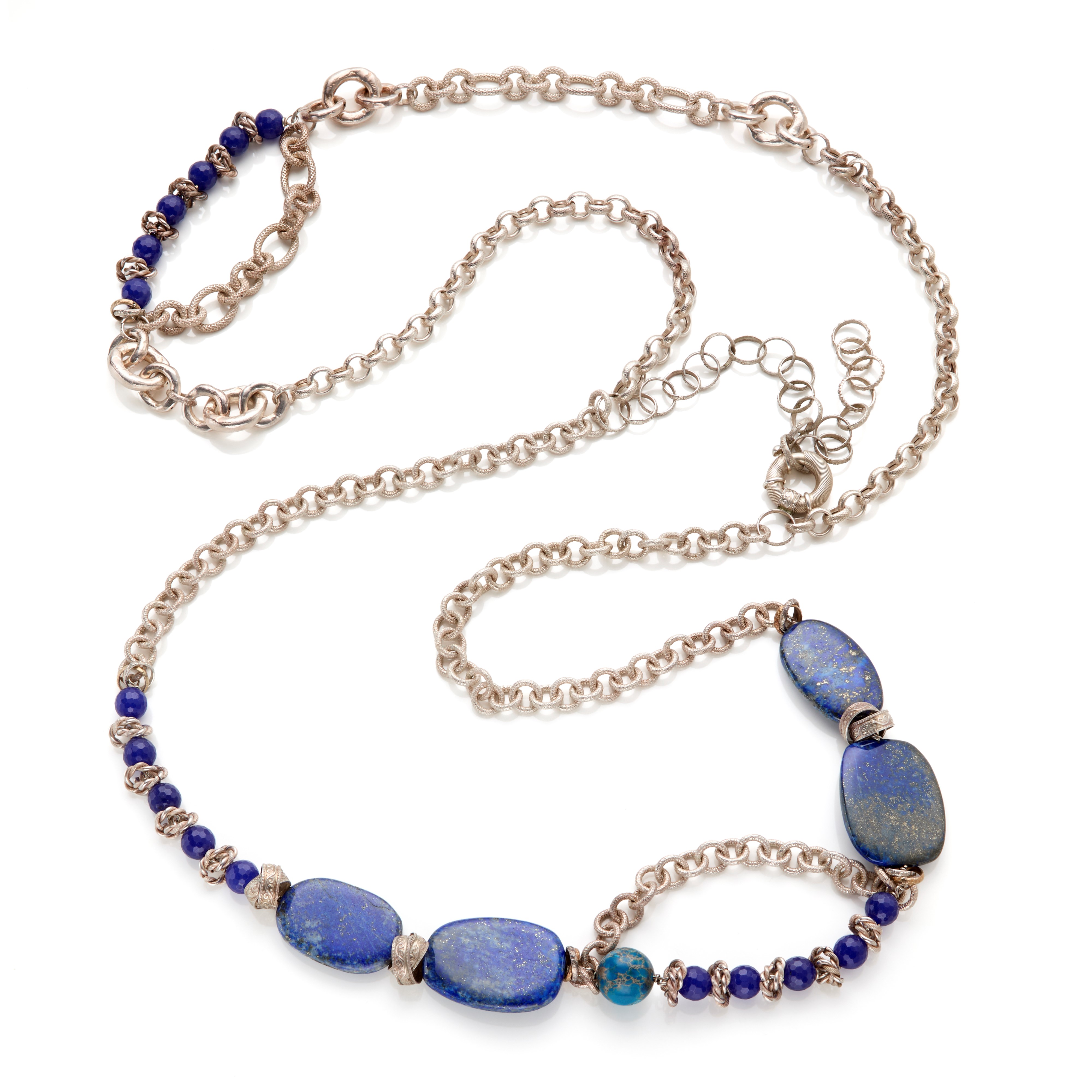 Long two-chain silver necklace decorated with lapis lazuli plaques and faceted blue beads. Accompanied by Giuseppina Fermi jewellery certificate.