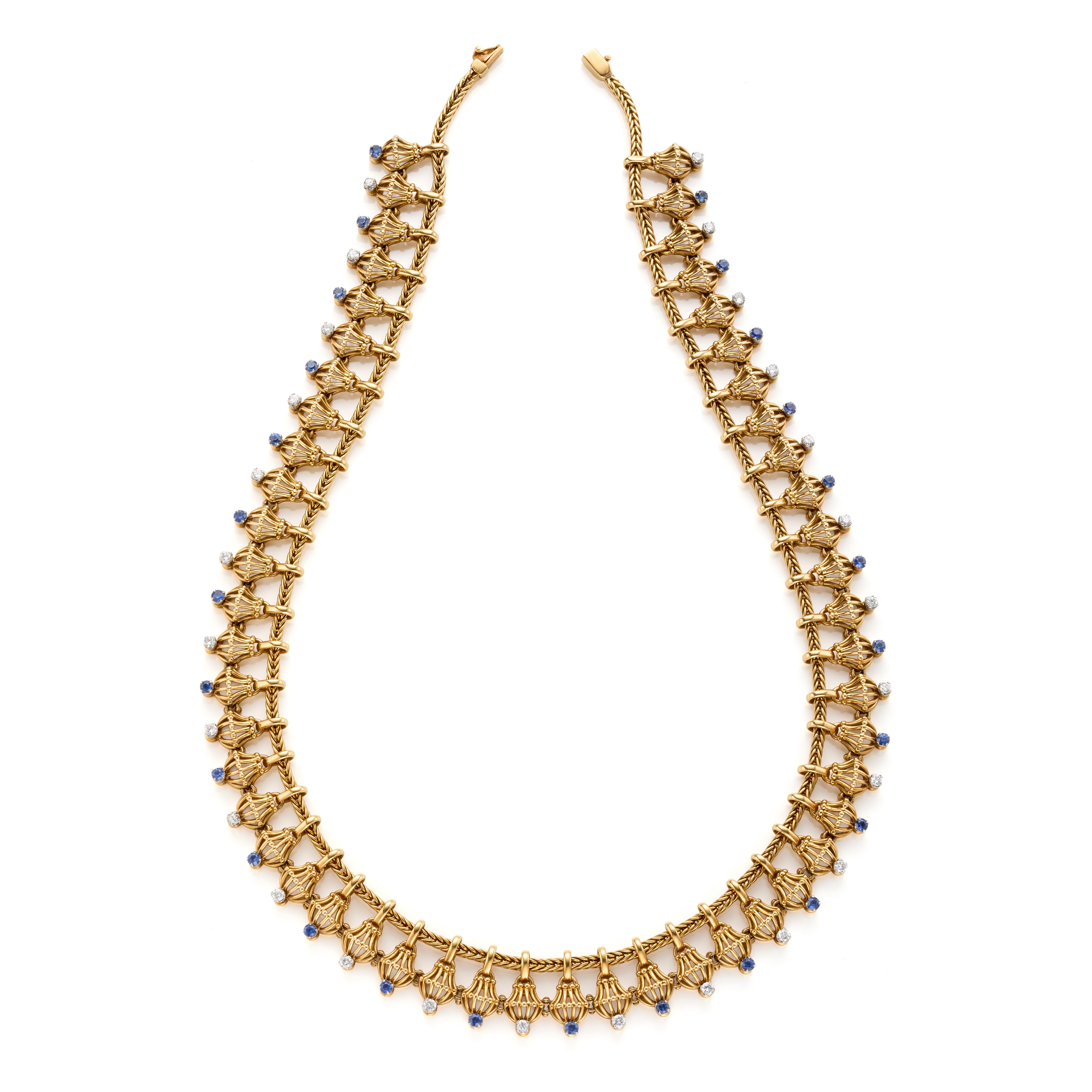 Collier modulare in oro giallo 18 Kt rifinito con diamanti rotondi per complessivi circa 1 ct e zaffiri rotondi.