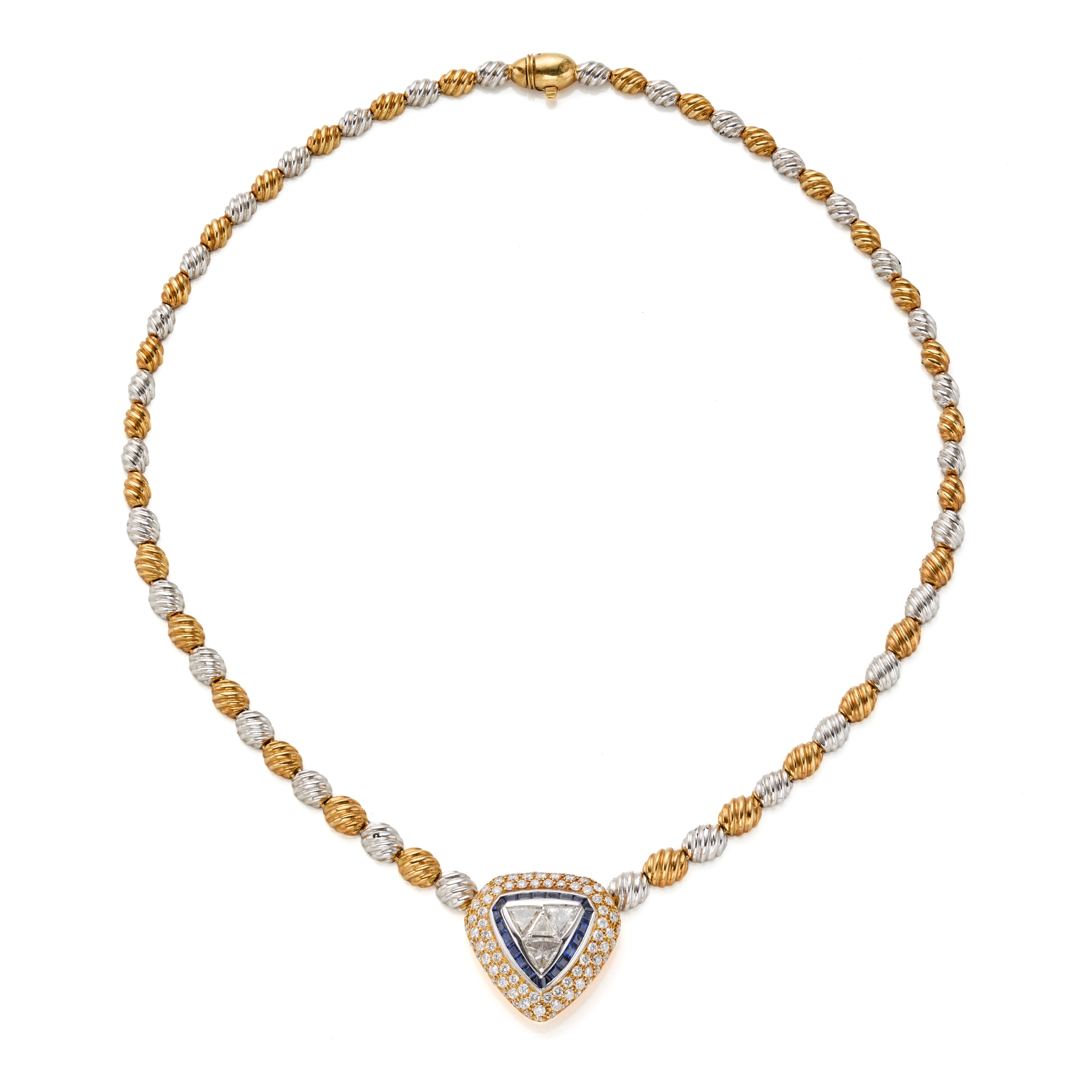 Collier in oro giallo e bianco 18 Kt con centrale rifinito con pavè di diamanti per complessivi circa 1,50 ct a contornare quattro diamanti taglio trilliant per complessivi circa 1 ct, rifinito con zaffiri carrè e calibrè.