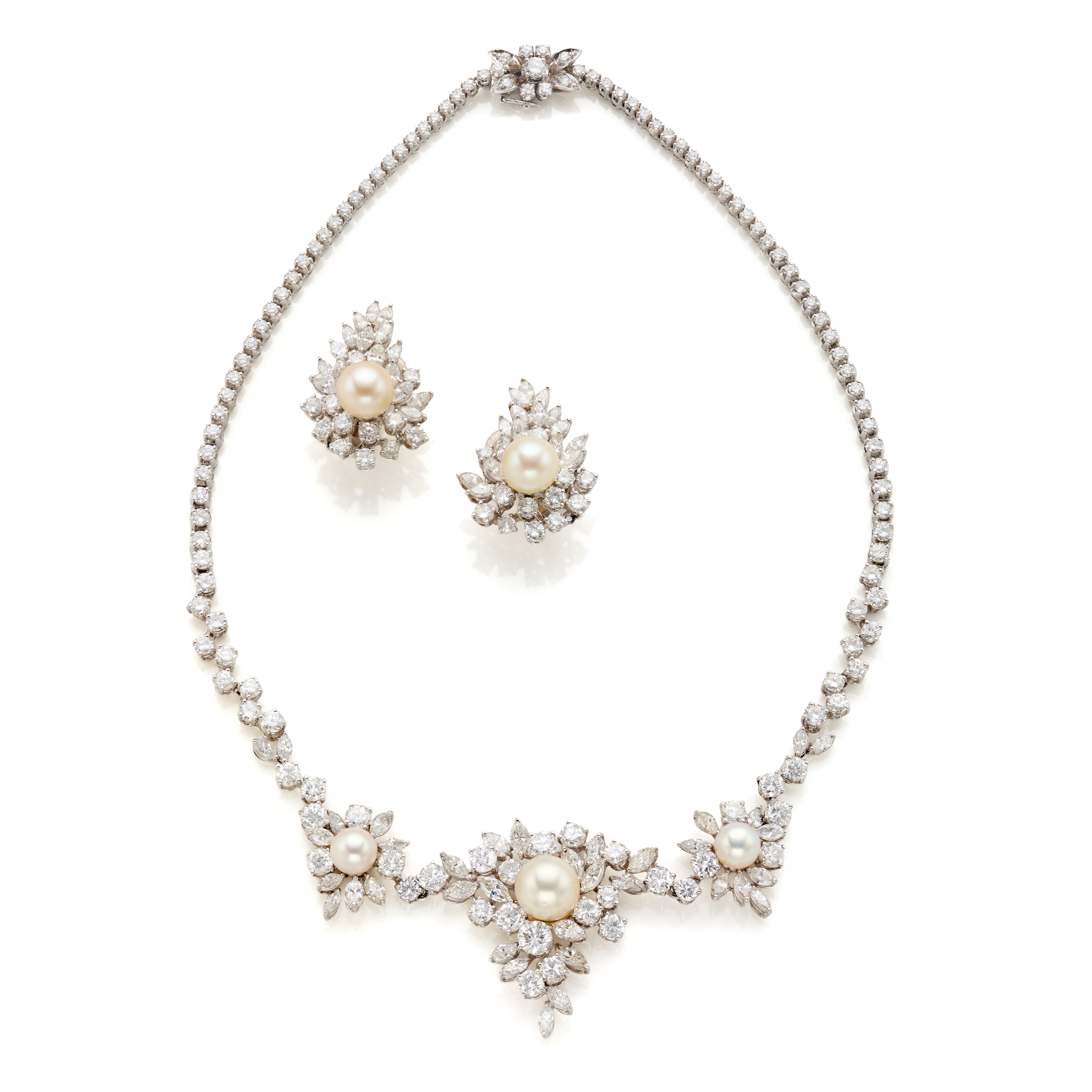 18 Kt white gold demi parure consisting of necklace and earrings set with white cultured pearls measuring from approx. 7 mm to 9,50 mm, round and marquise diamonds totalling approx. 19,45 ct.