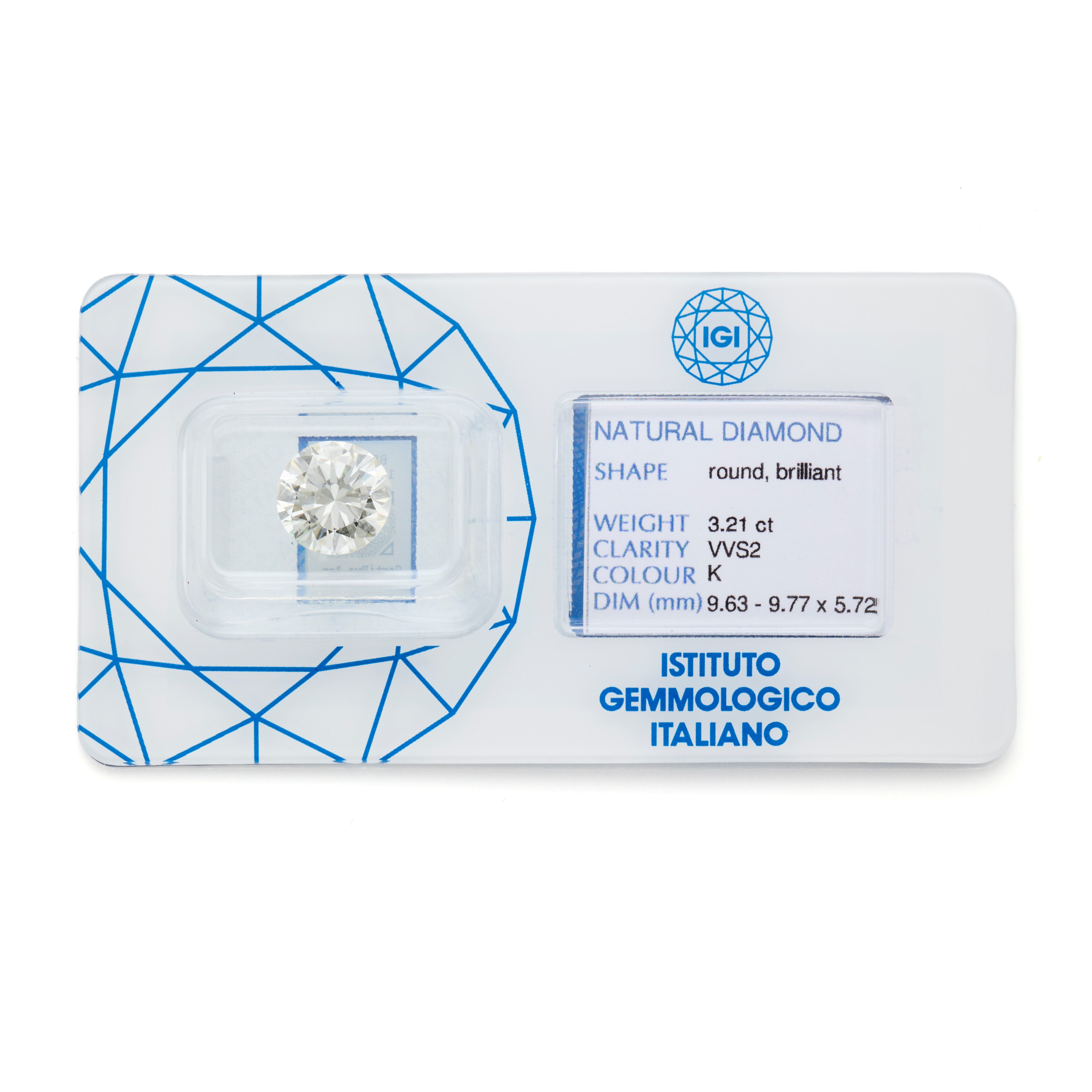 Diamante rotondo taglio a brillante di 3,21 ct, in blister.
