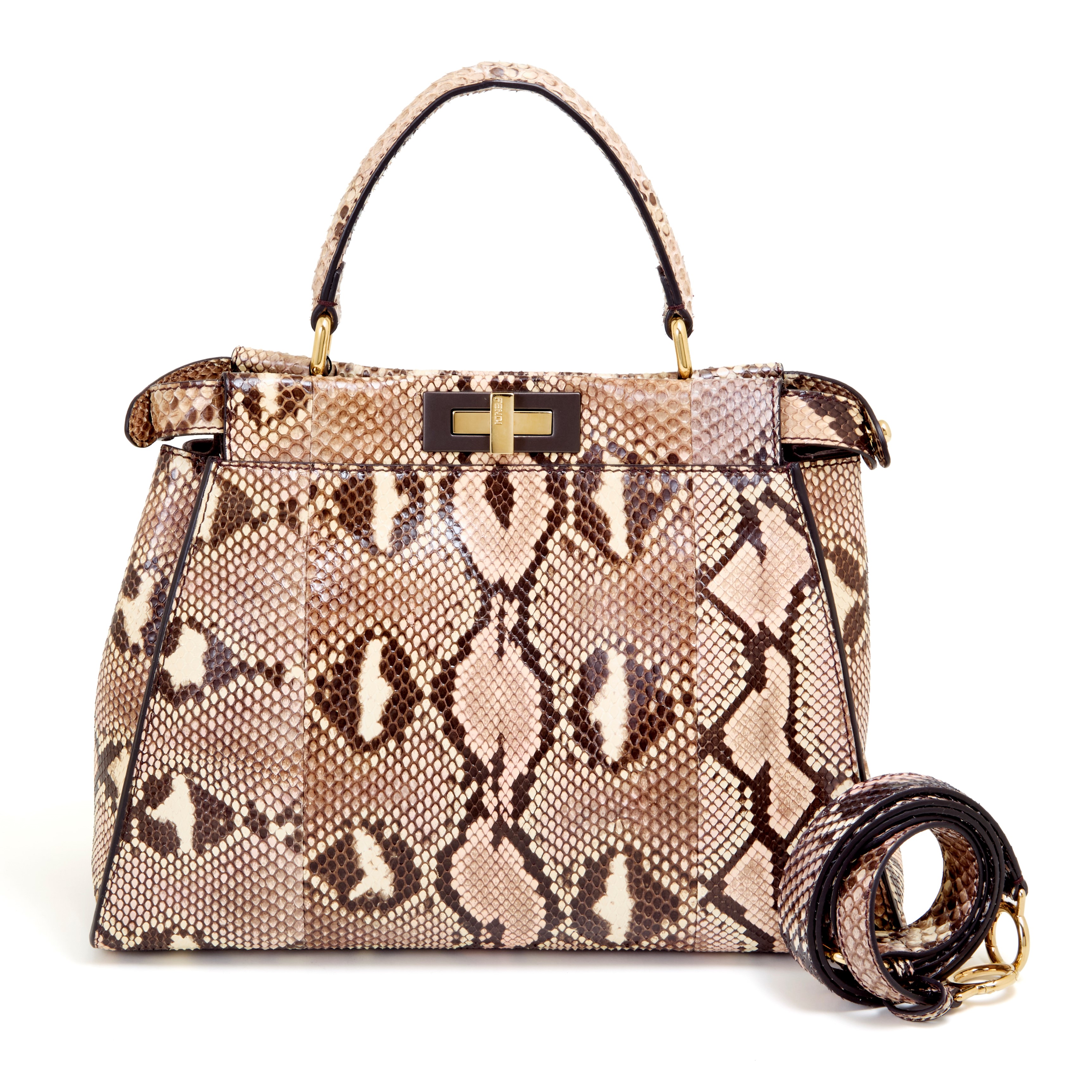 Fendi Peekaboo bag in sand and pink reticulated python with graphite hardware. Two inner compartments. Original removable adjustable shoulder strap, rain cover, CITES certificate and dustbag included. Very good conditions (flaw on the handle).
