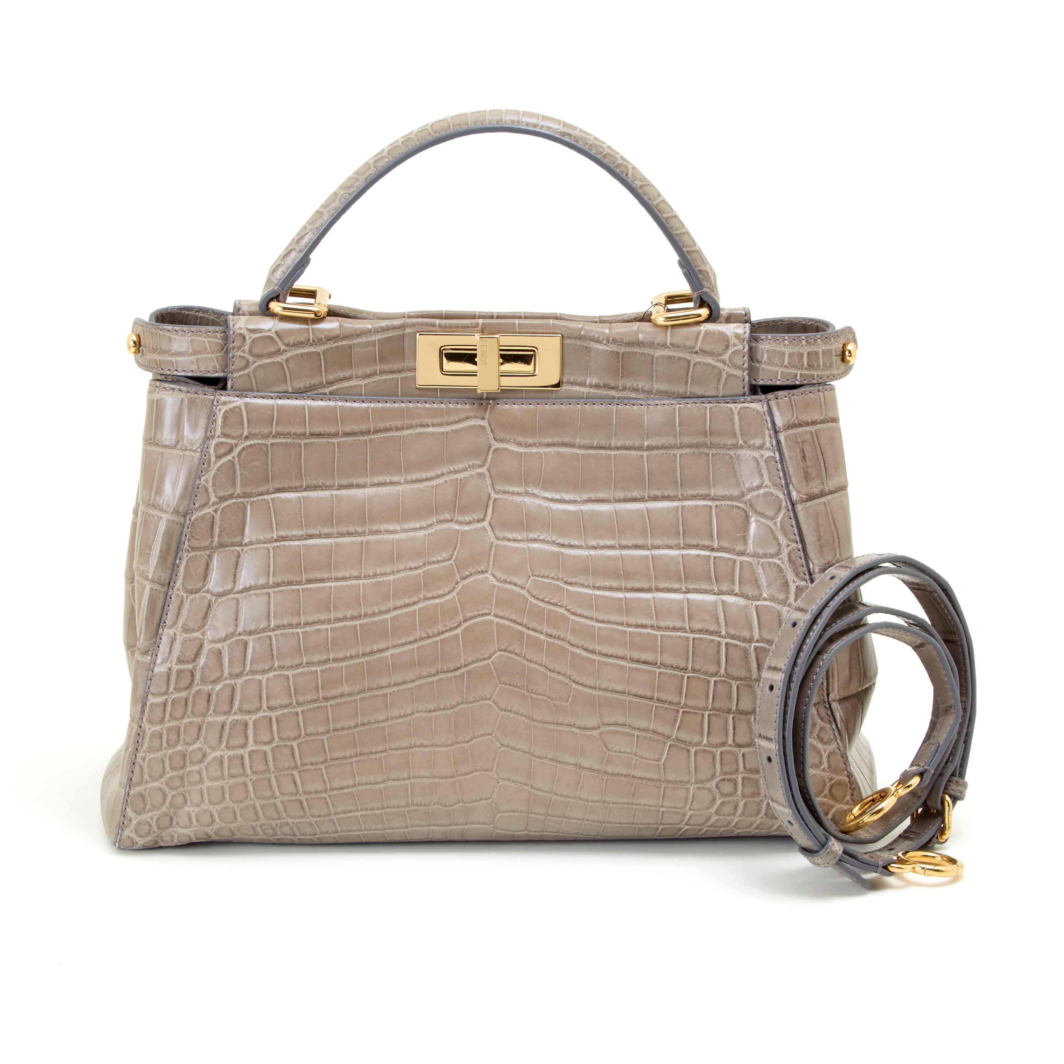 Fendi Peekaboo bag in gray Nile crocodile with golden hardware. Two inner compartments. Removable adjustable shoulder strap, rain cover, CITES certificate and original dustbag included. New.
