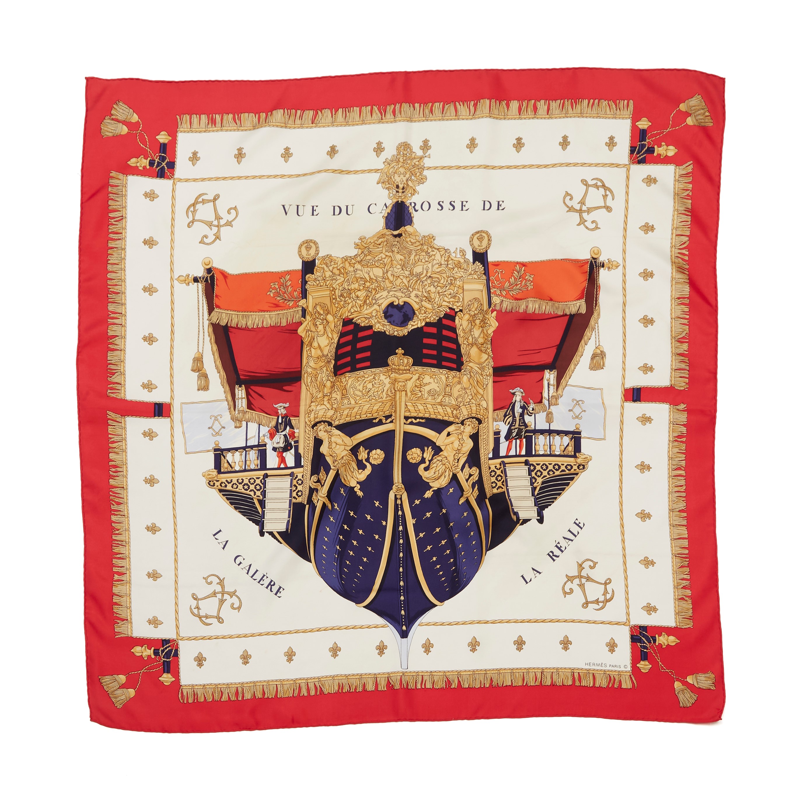 Hermès vintage silk "Vue Du Carrosse - La Galère - La Réale" scarf designed by Hugo Grygkar, 1992. Very good conditions.