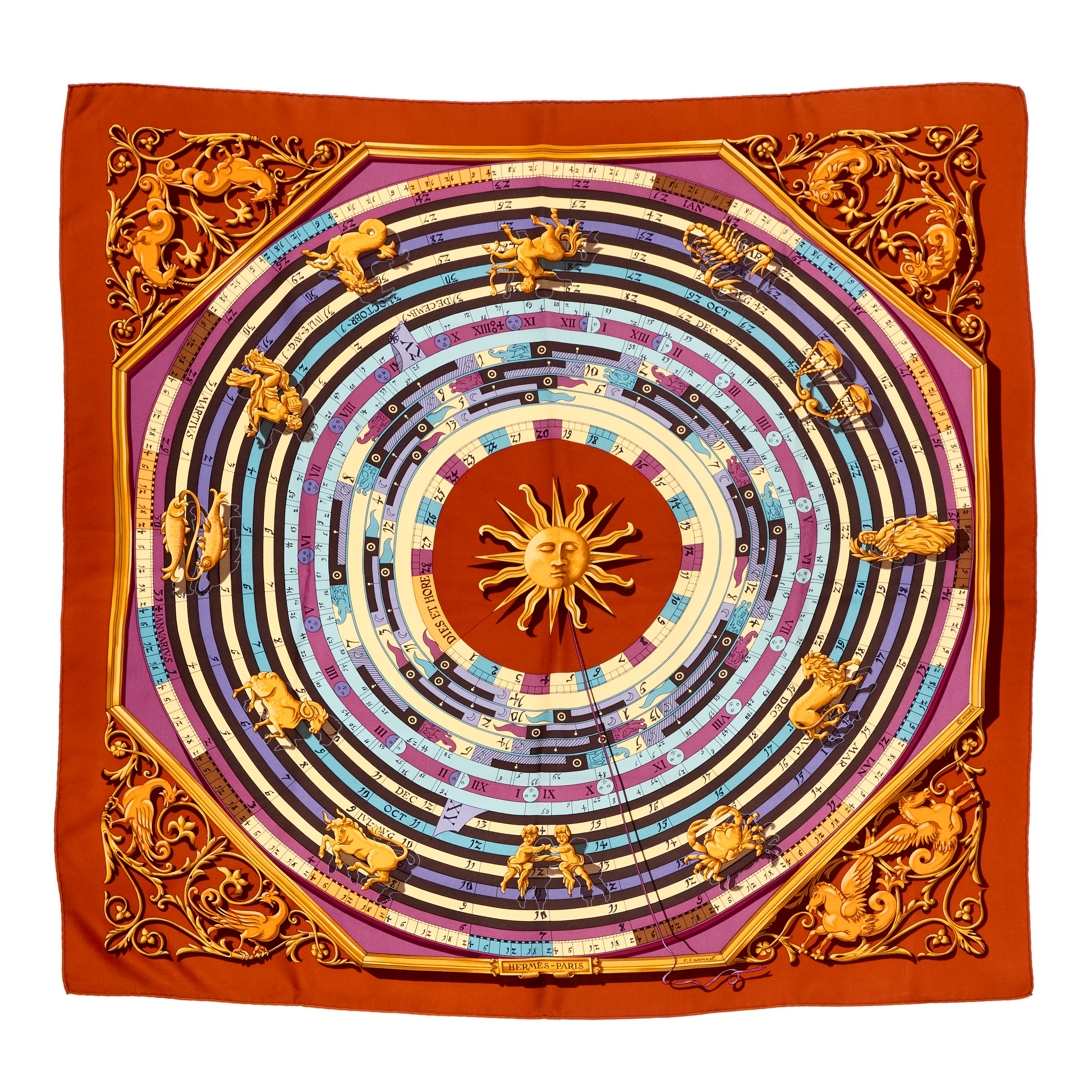 Foulard Hermès vintage in seta ""Dies et Hore "" disegnato da Françoise Faconnet, 1963. Condizioni molto buone.