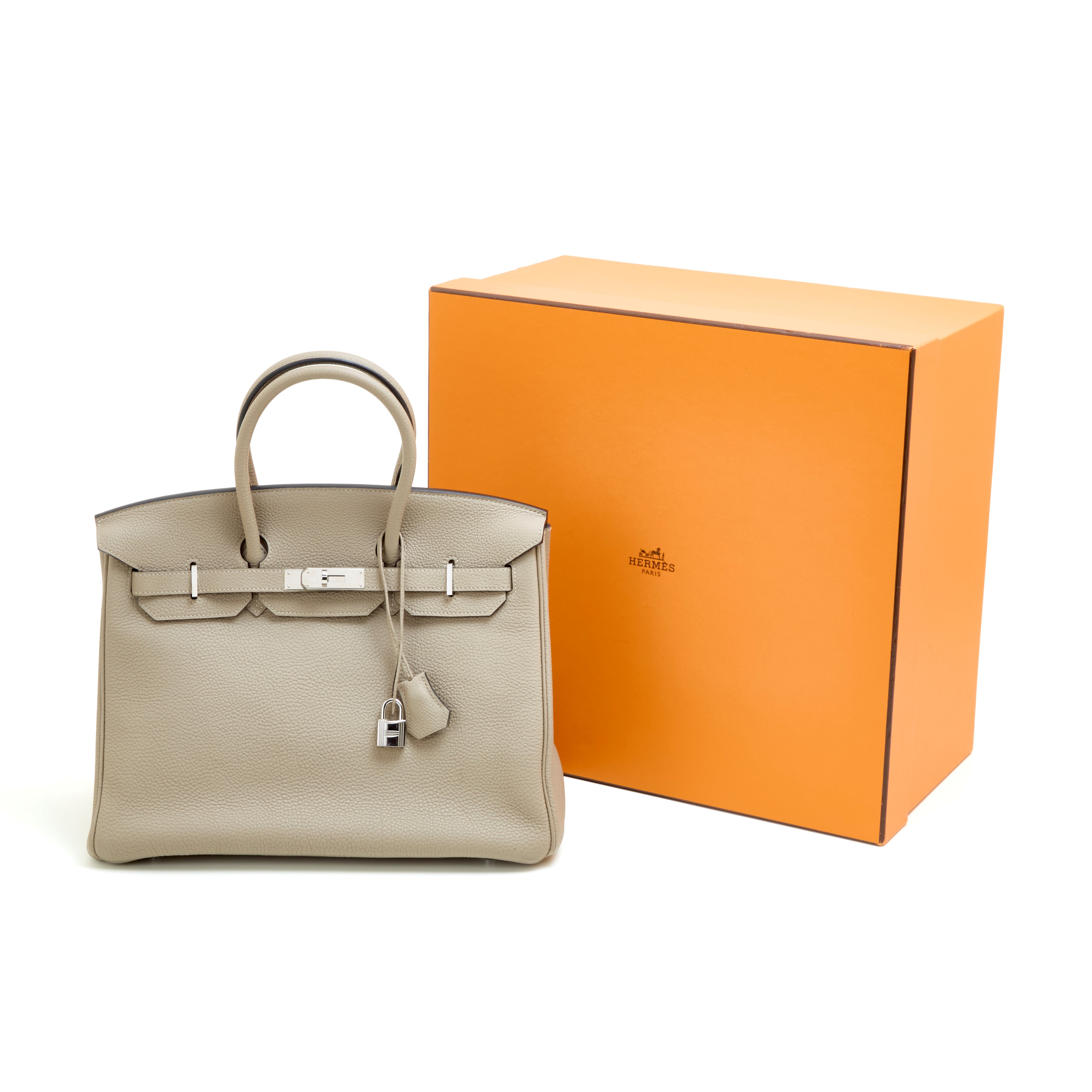 Hermès Birkin 35 in pellame Togo Taupe con metalleria palladio, 2011. Completa di clochette con chiavi, lucchetto, rain cover, dustbag e scatola originali. Condizioni molto buone.