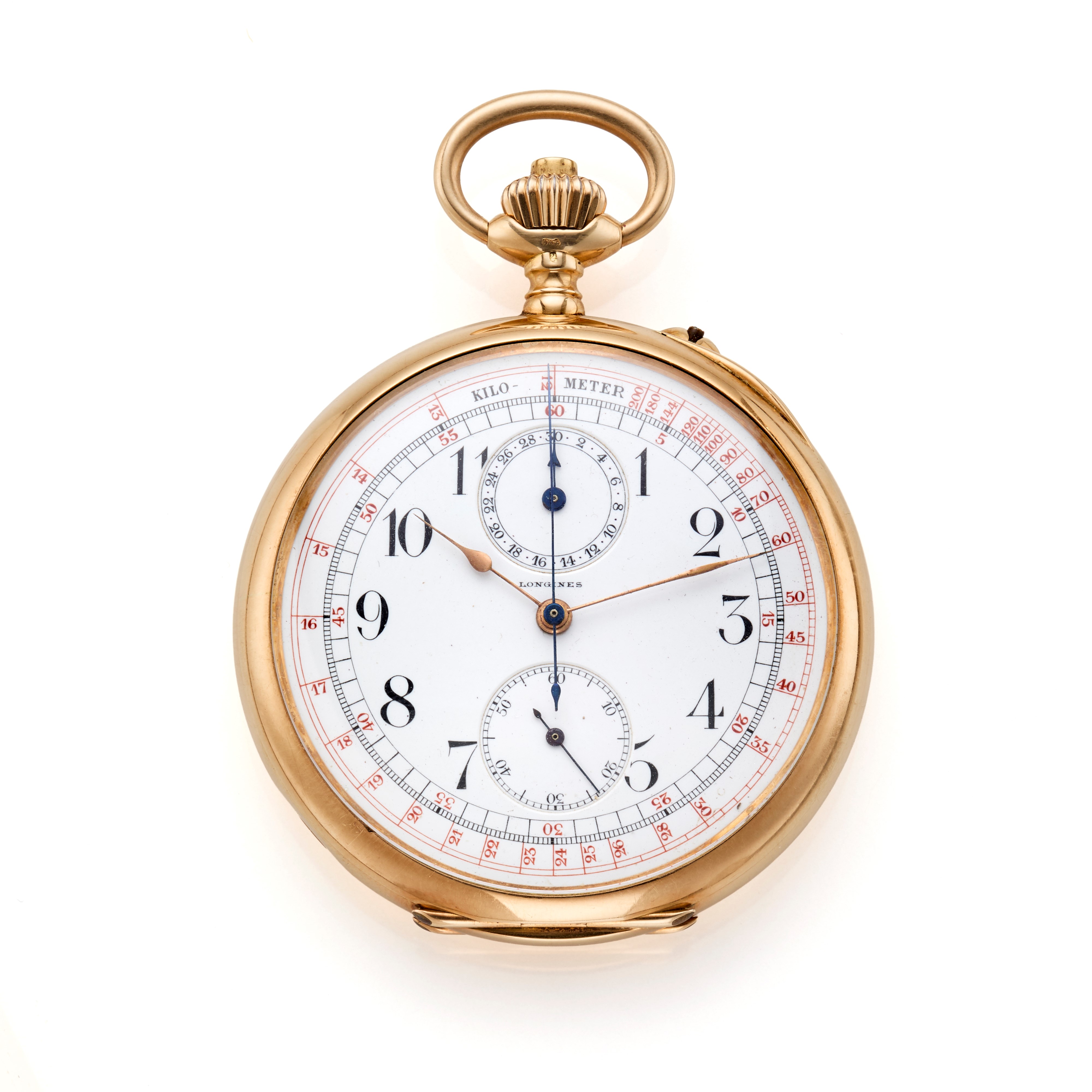 Longines orologio da tasca cronografo. Cassa in oro giallo 14 Kt. Movimento meccanico a carica manuale. Buone condizioni.