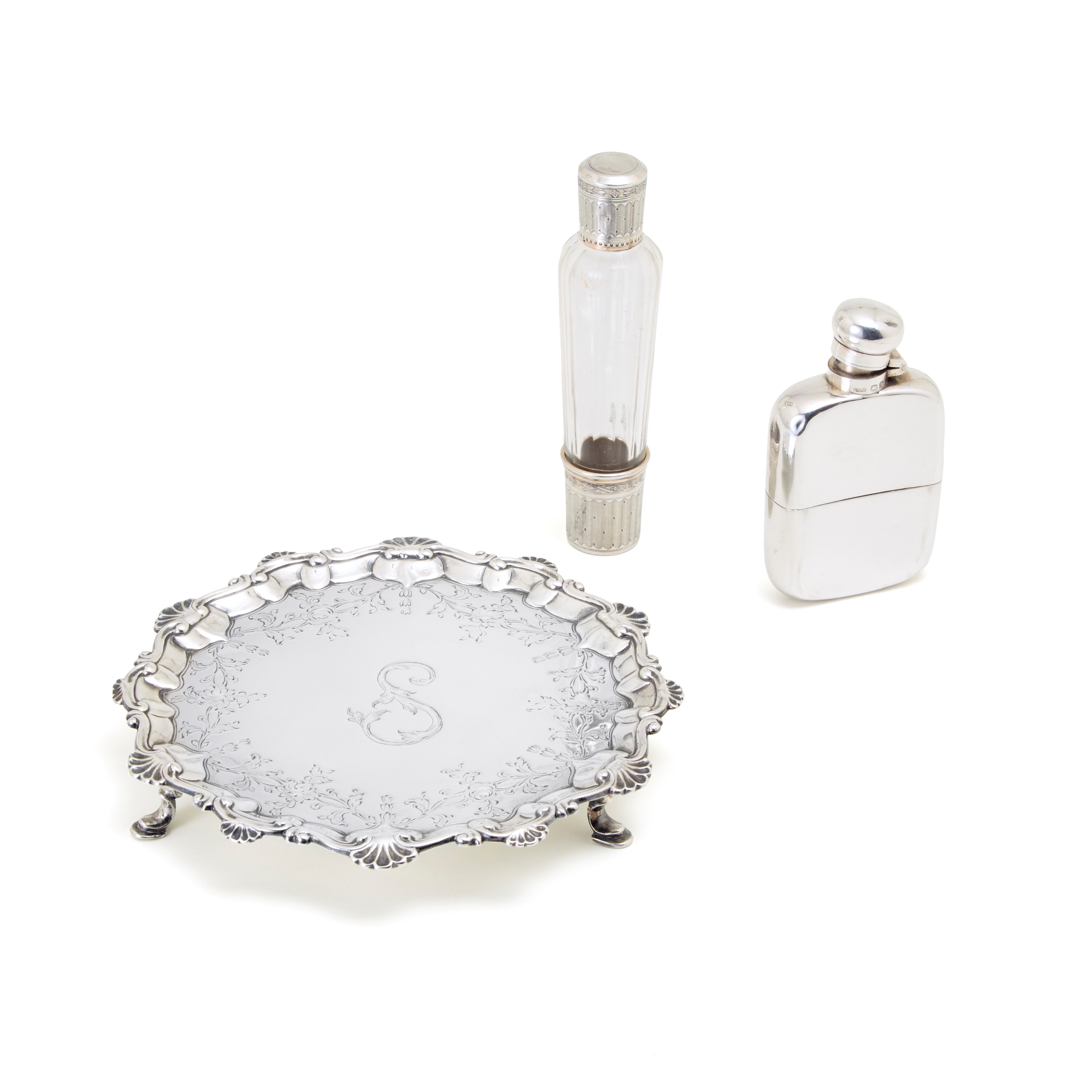 Lotto in argento composto da un centrotavola con piedini e una fiaschetta con punzoni inglesi uniti ad un'ampolla portaprofumo di diversa manifattura.