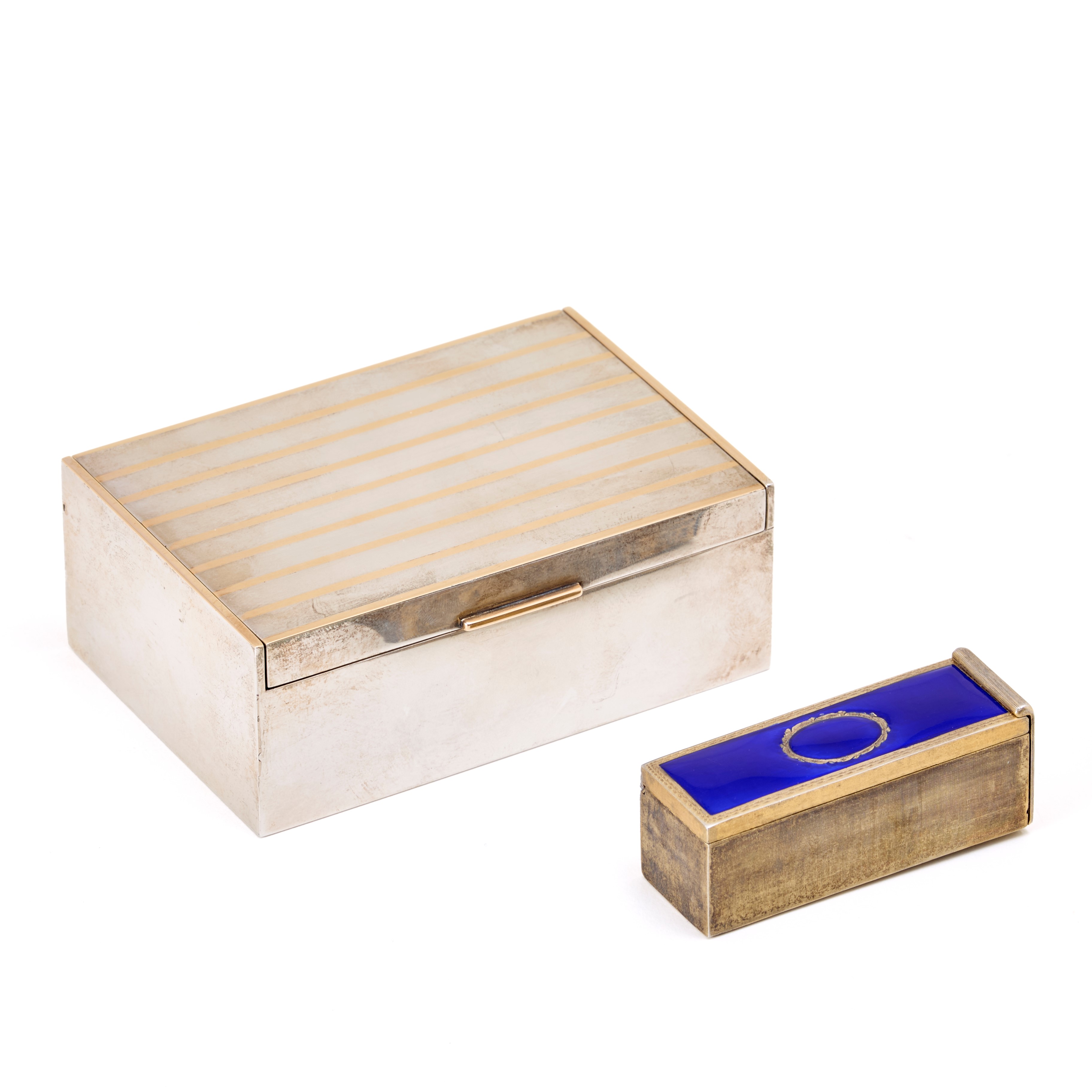 Silver lot consisting of a gold-plated lipstick holder finished with enamel and an internal mirror, combined with a box decorated with gold stripes.