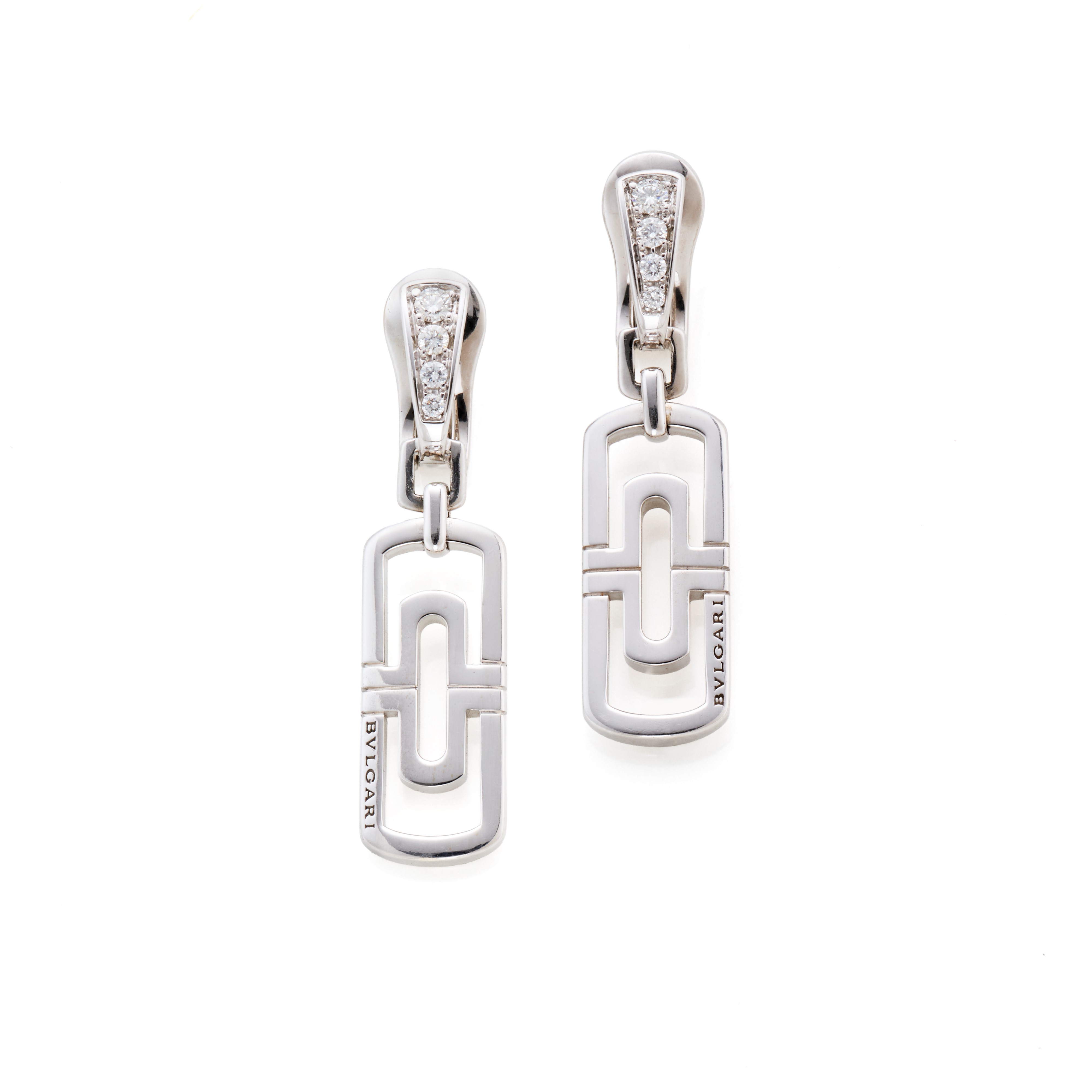 Orecchini Bulgari, collezione Parentesi, in oro bianco 18 Kt rifiniti con diamanti rotondi per complessivi circa 0,30 ct.