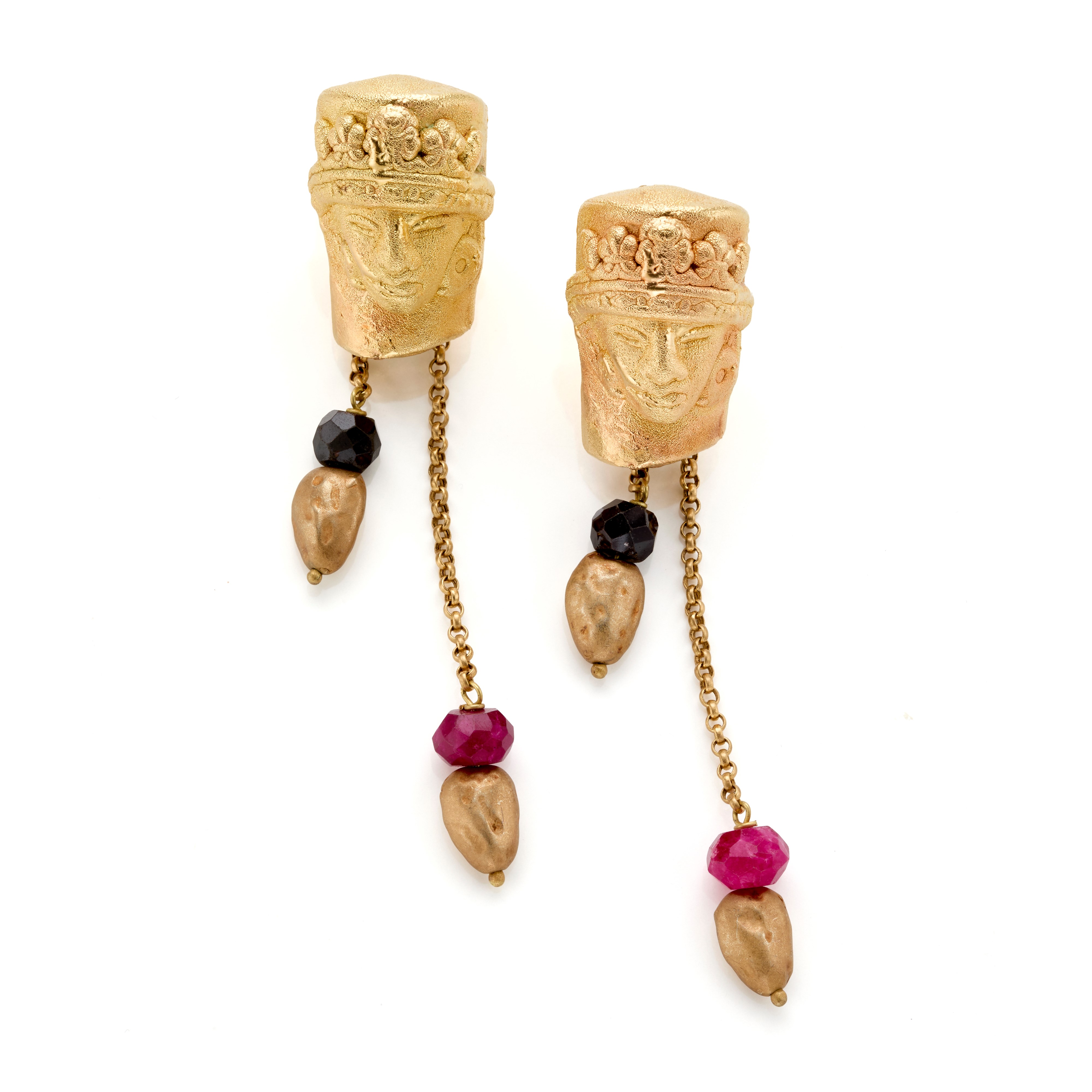 18 Kt yellow gold drop earrings, decorated with pre-Columbian-style masks with faceted ruby and onyx beads. Designed by Giuseppina Fermi Gioielli.