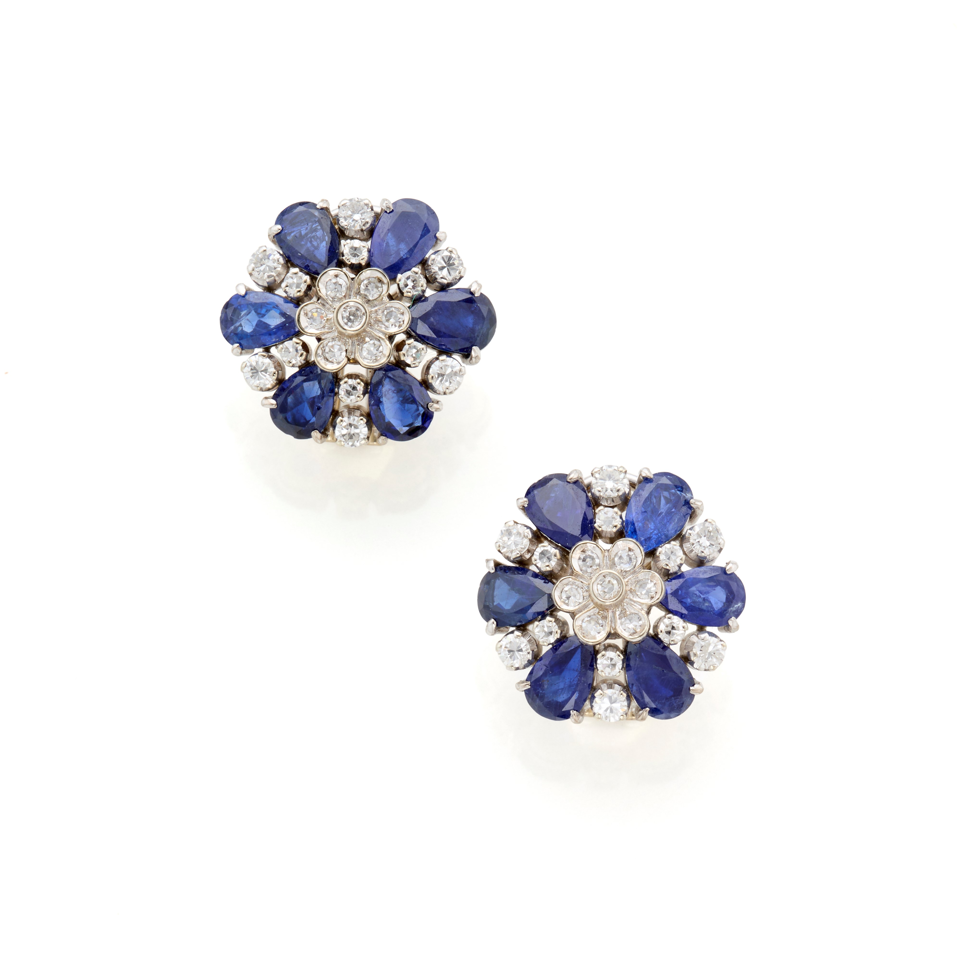 Orecchini in oro bianco 18 Kt a fiore con diamanti rotondi per complessivi circa 0,85 ct e zaffiri a goccia per complessivi circa 8,40 ct.