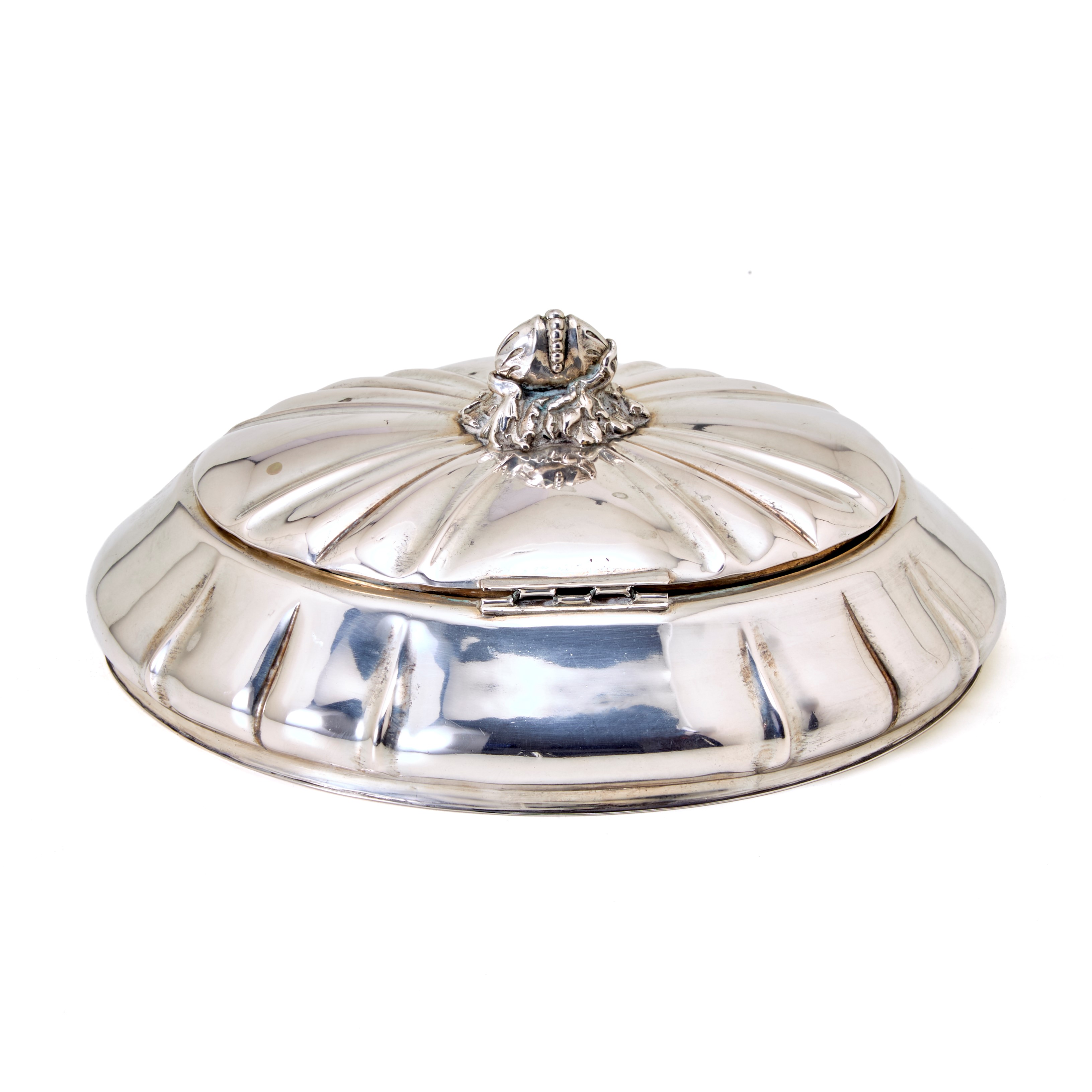Scatola in argento di forma ovale con presa del coperchio a conchiglia.