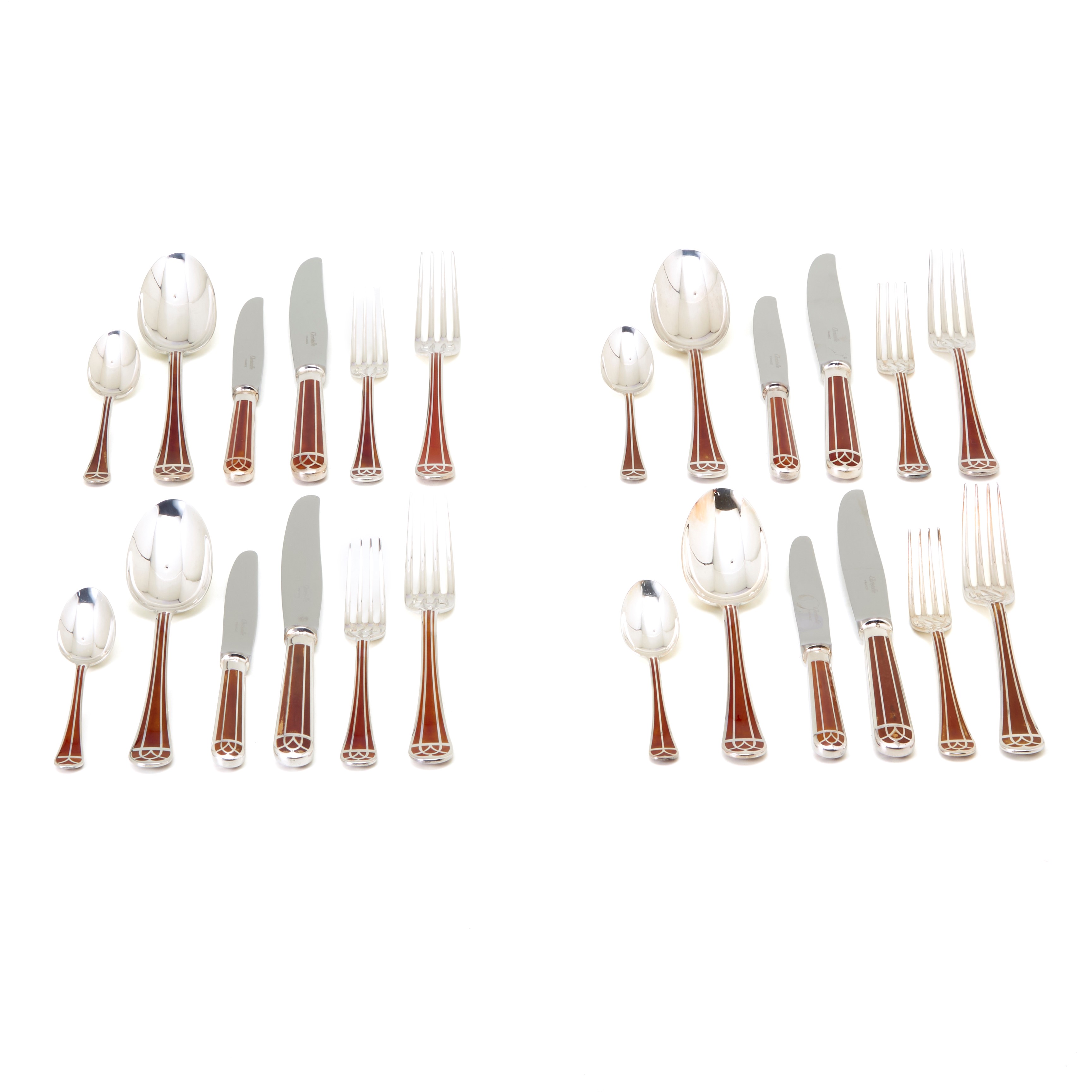 ‘Talisman’ cutlery set in silver-plated and brown Chinese lacquer signed Christofle, consisting of: four large and small knives, four large and small forks, four large and small spoons.