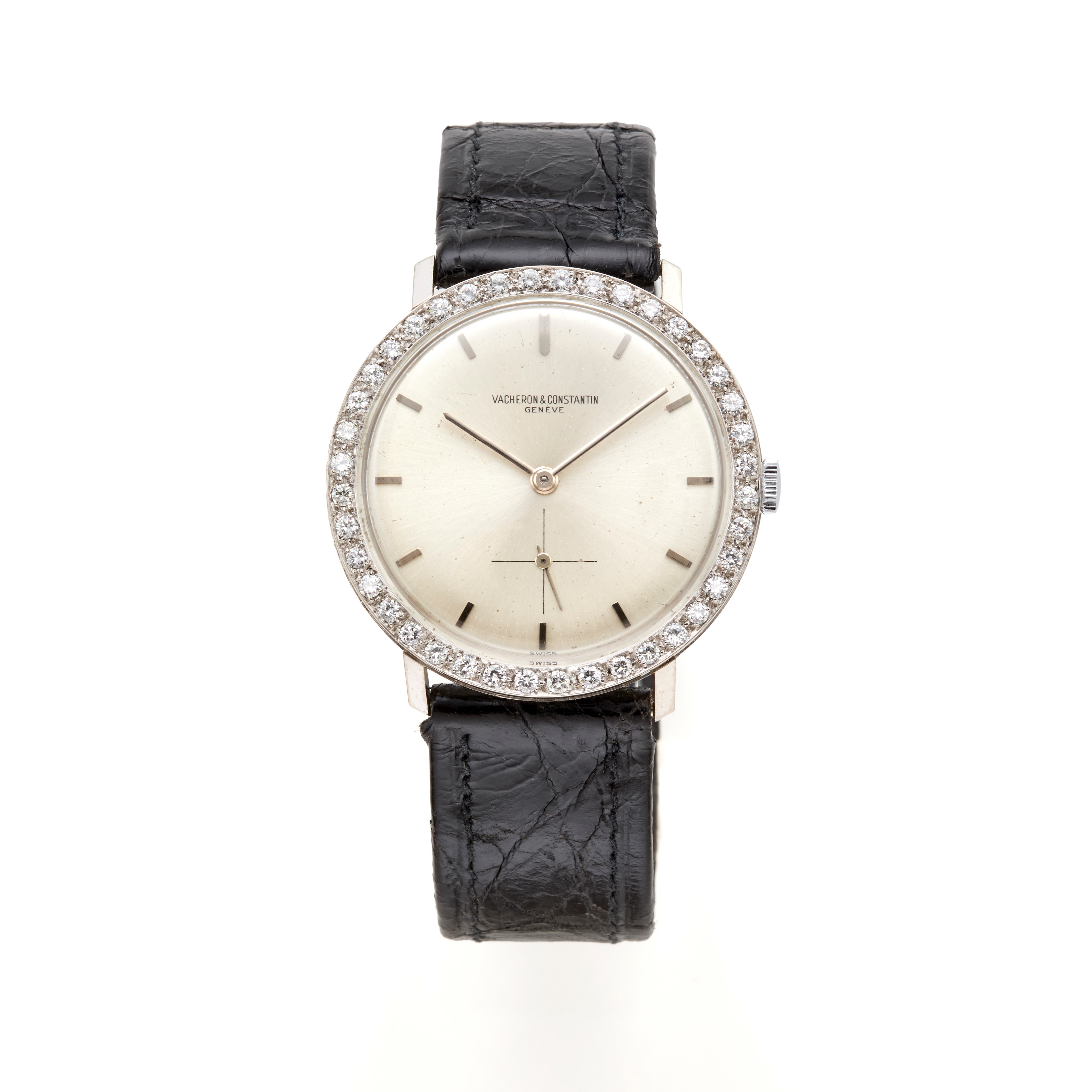 Vacheron Constantin Genève ultrapiatto fine anni '60 in oro bianco 18 Kt con lunetta in diamanti, quadrante argenteè con quadrantino per i secondi. Cinturino in pelle e fibbia entrambi Paul Picot. Movimento meccanico a carica manuale. Ottime condizioni.