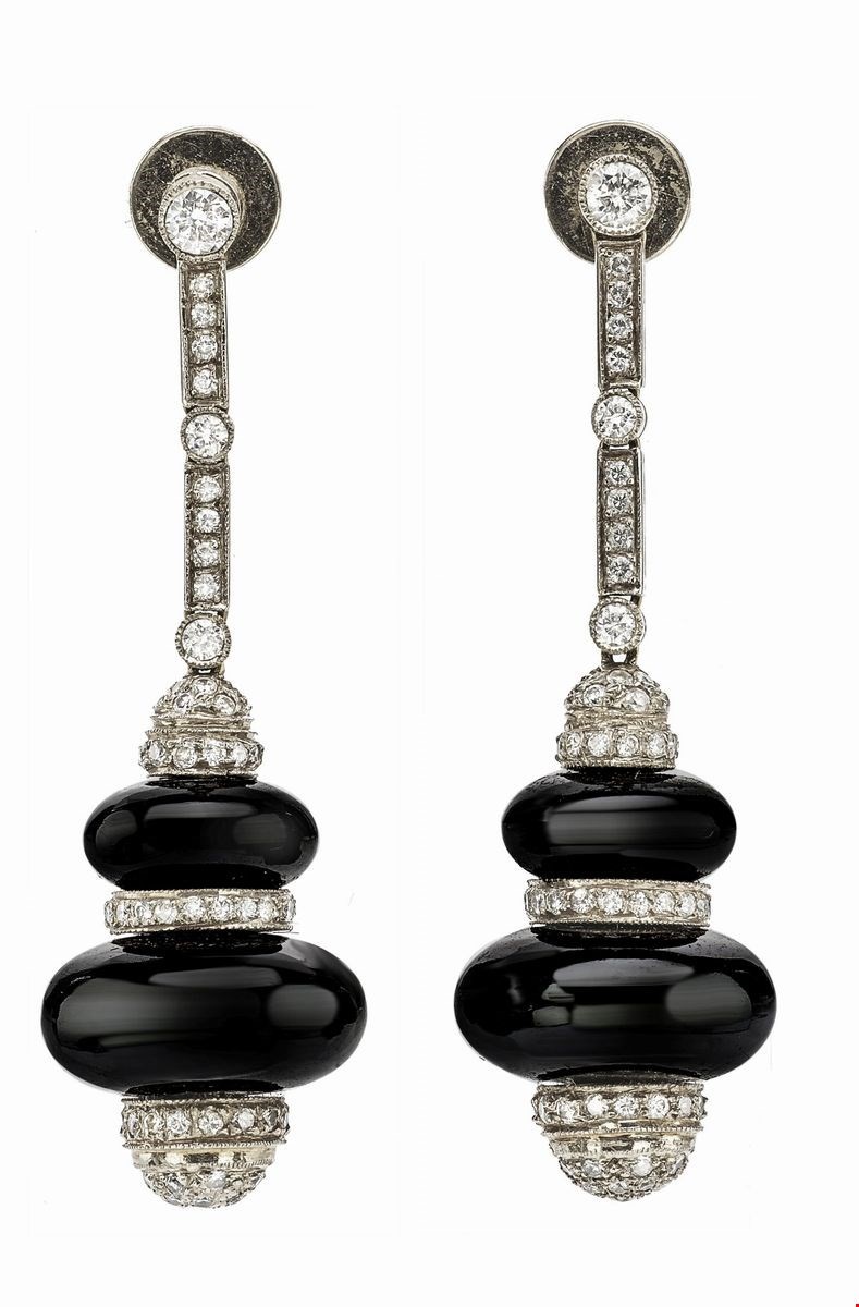 18 Kt white gold drop earrings with round diamonds totalling approx. 0,50 ct and onyx.