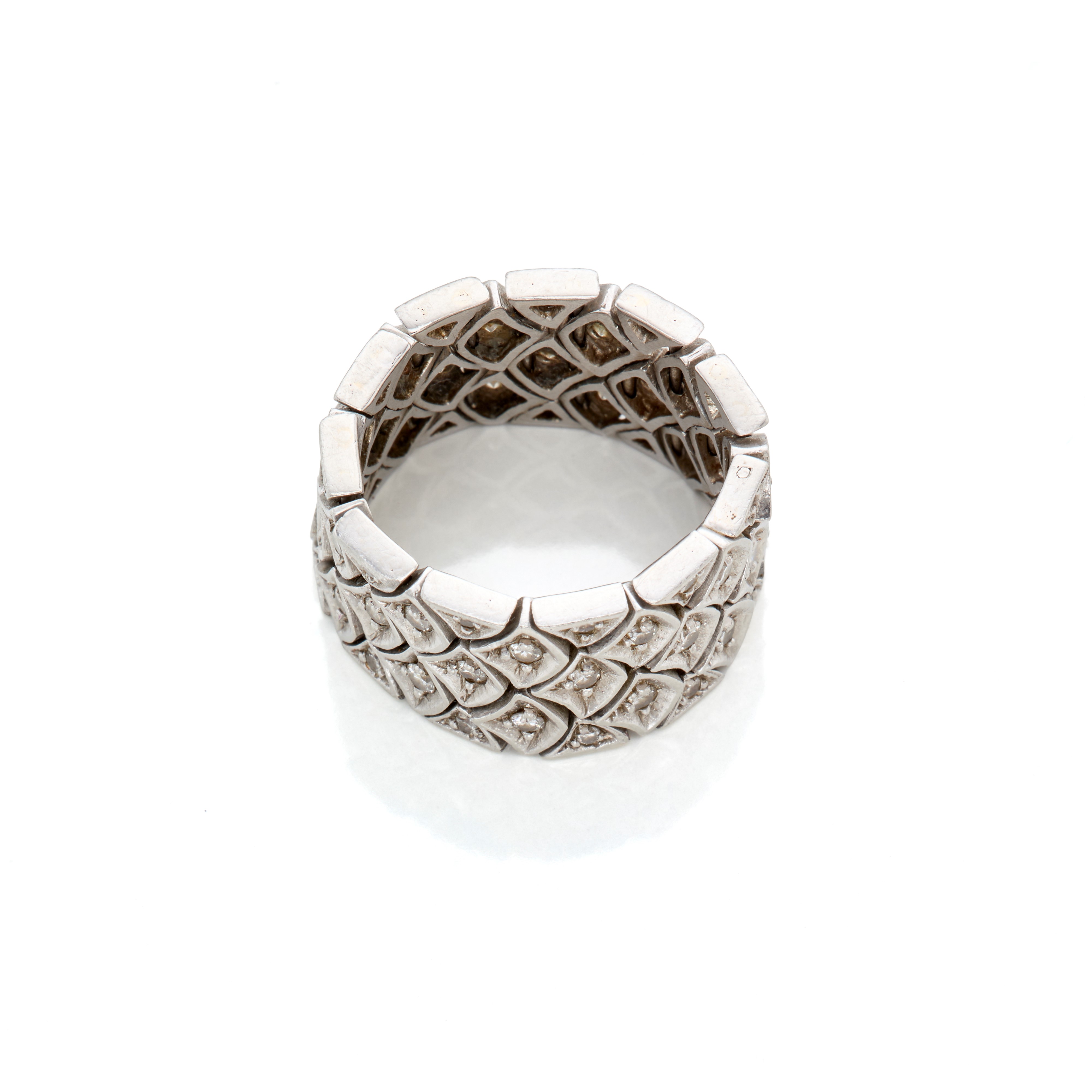 Anello a fascia a maglia morbida in platino con diamanti rotondi per complessivi circa 0,30 ct.