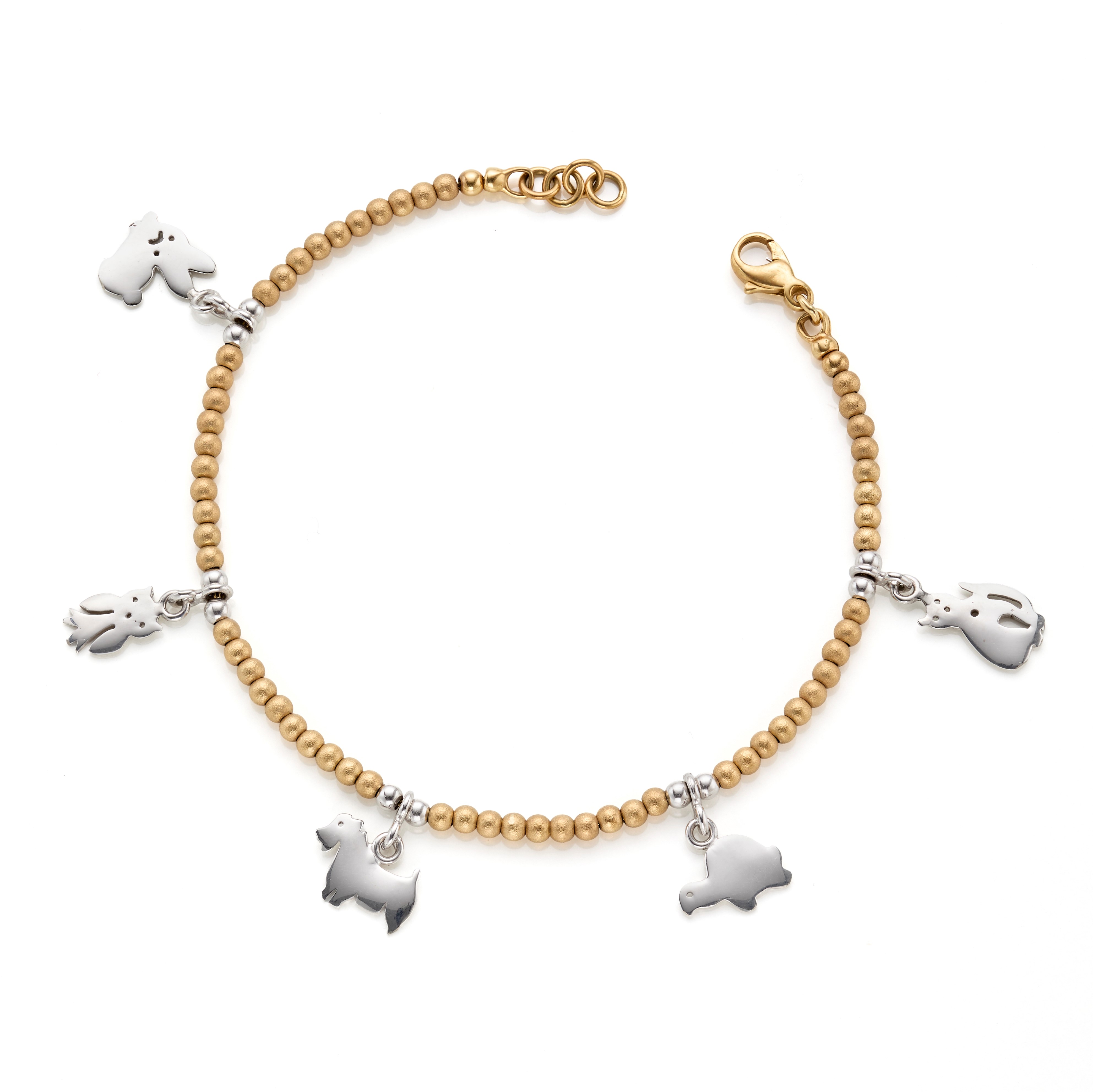 Bracciale a piccole boules in oro giallo satinato 18 Kt con charms in oro bianco 18 Kt.