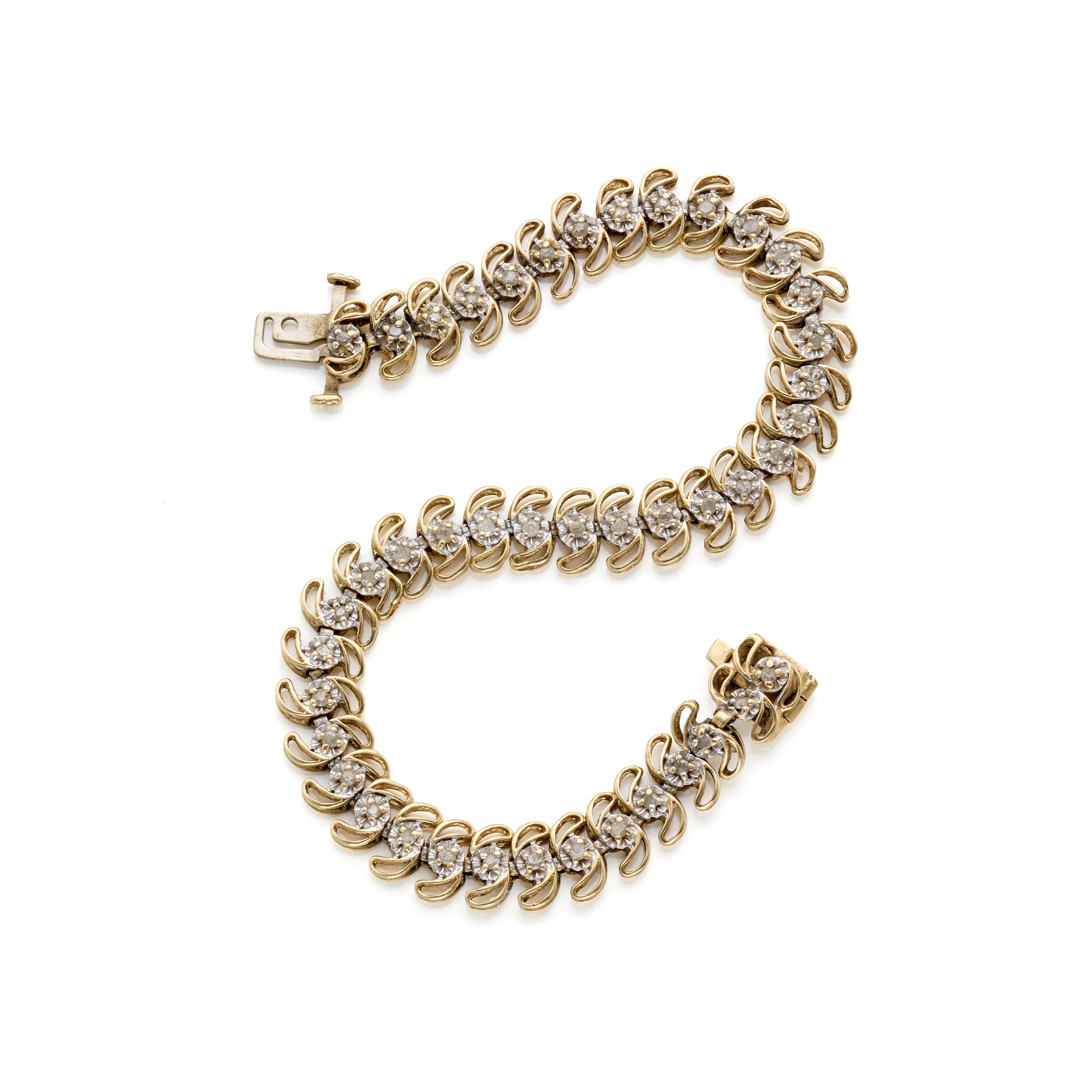 Bracciale in oro bianco e giallo 9 Kt rifinito con diamanti rotondi.