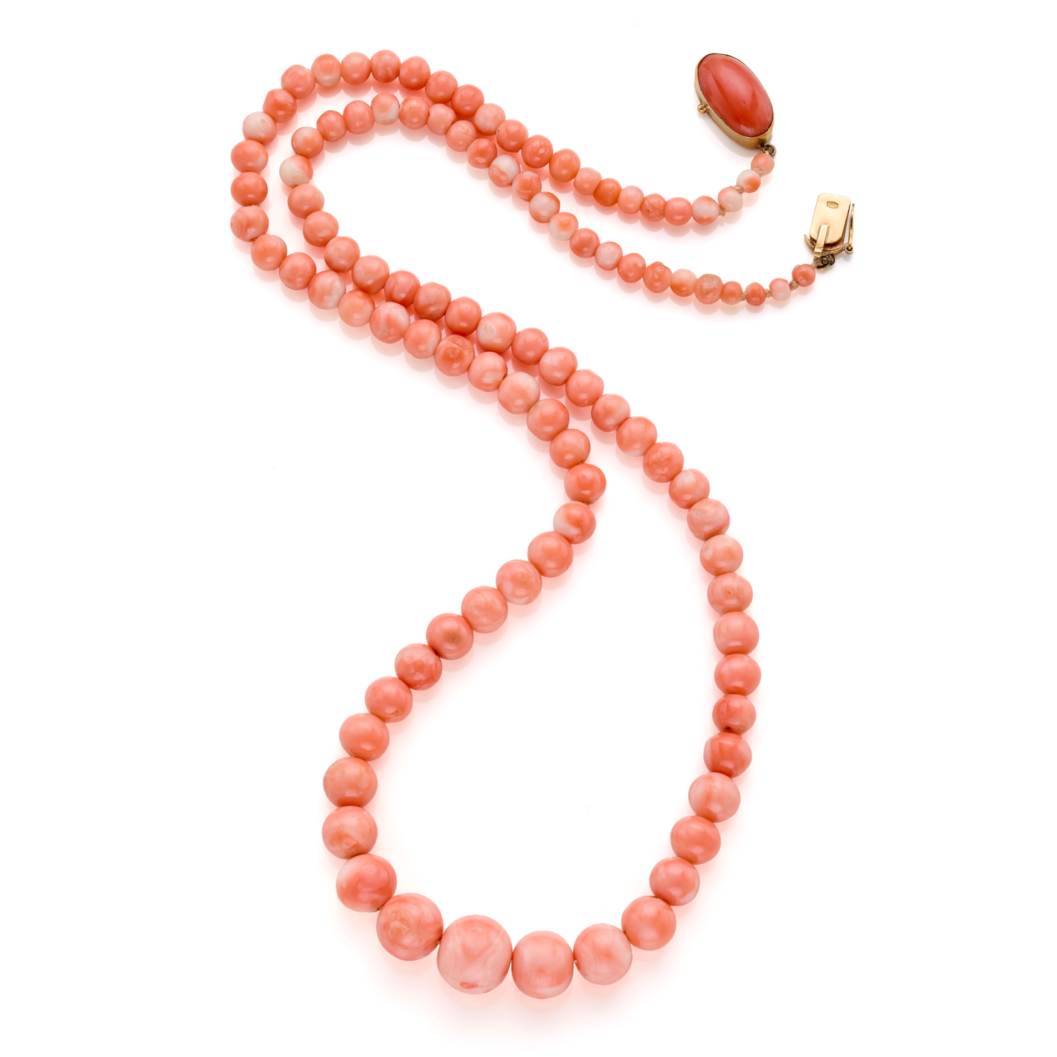 Necklace with pink coral boules from approx. 11 mm to approx. 3 mm and 18 Kt yellow gold clasp with oval cabochon coral.