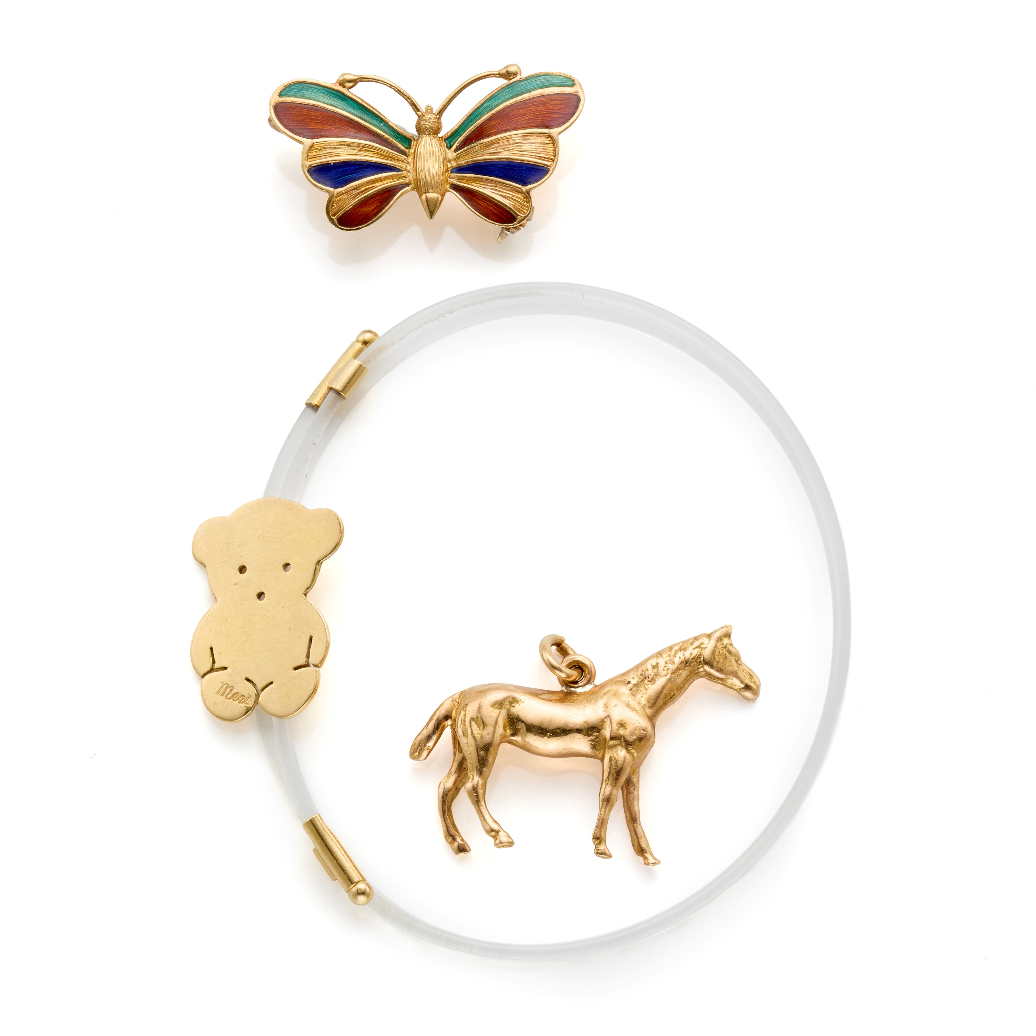 Lotto in oro giallo 18 Kt composto da un pendente, un bracciale e una spilla rifinita con smalti.