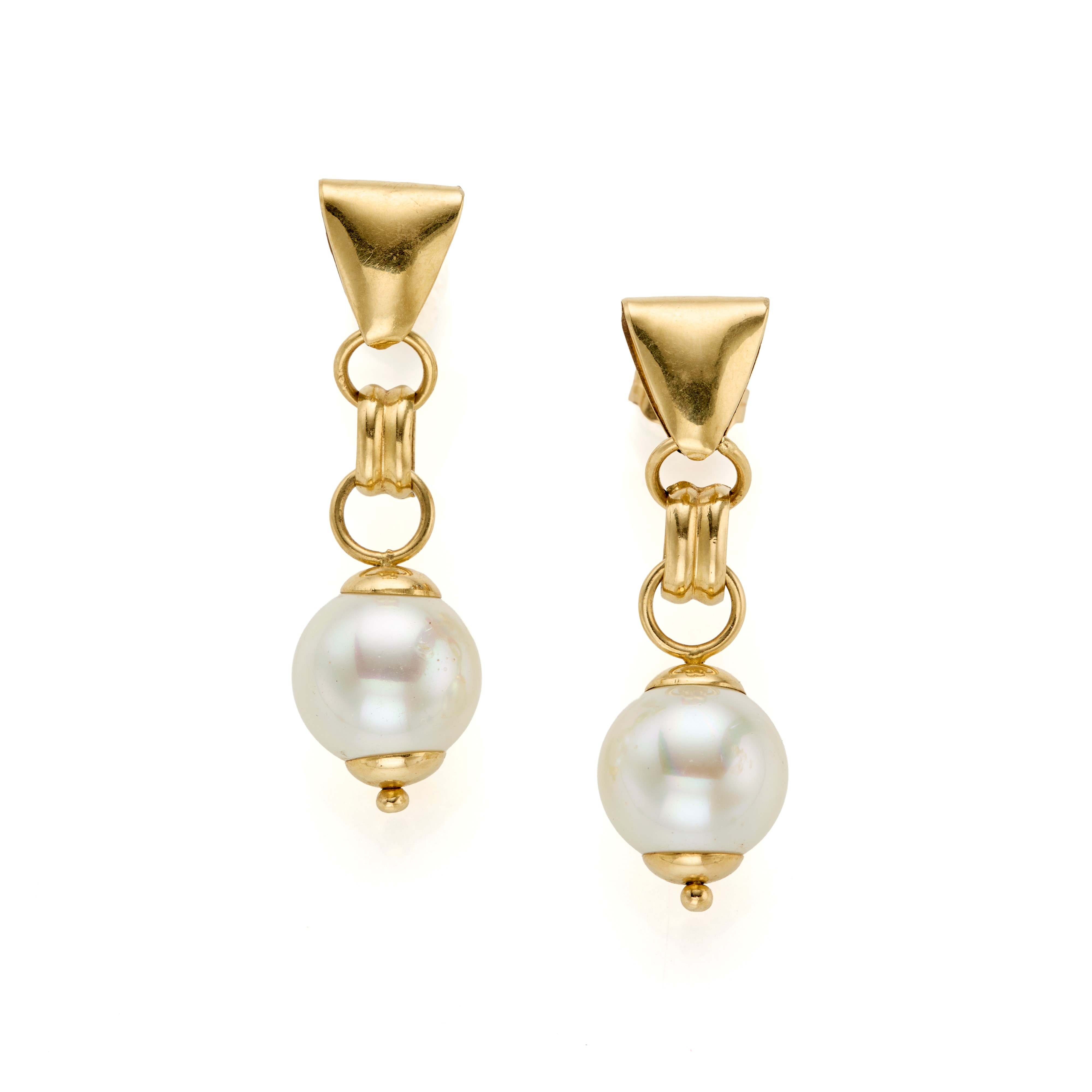 18 Kt yellow gold pendant earrings with white cultured pearls measuring approx. 10 mm.