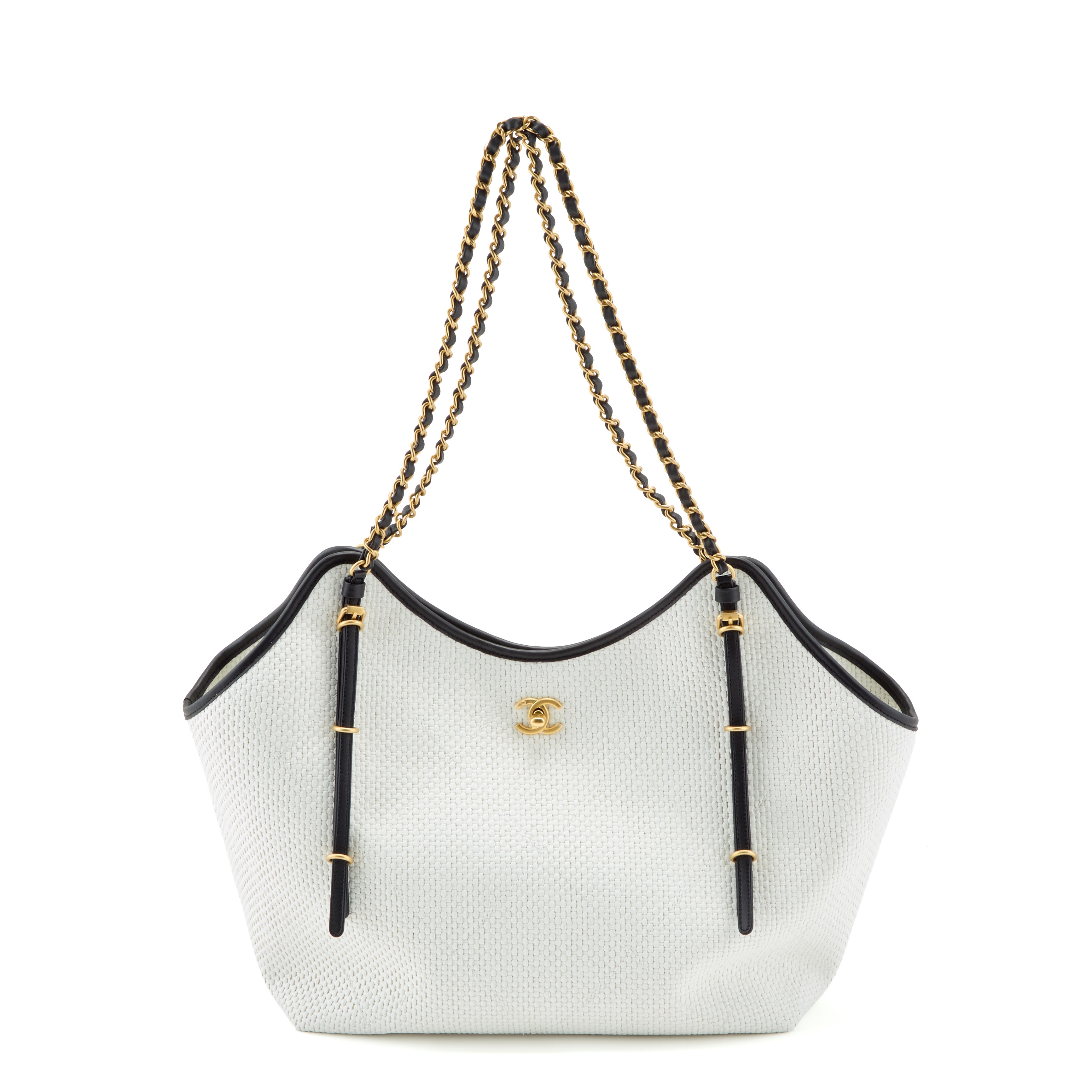 Maxi borsa shopping Chanel in tela effetto rafia intrecciata, dettagli in pelle e metalleria dorata opaca. Collezione attuale. Completa di dustbag originale. Nuova, con pelliccole.