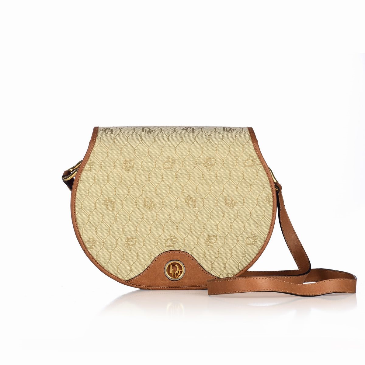 Dior vintage shoulder bag by Dior in monogram fabric and leather, with golden metal hardware and pressure closure. Leather interior lining with three open pockets and a hidden one under the open flap. Good conditions.