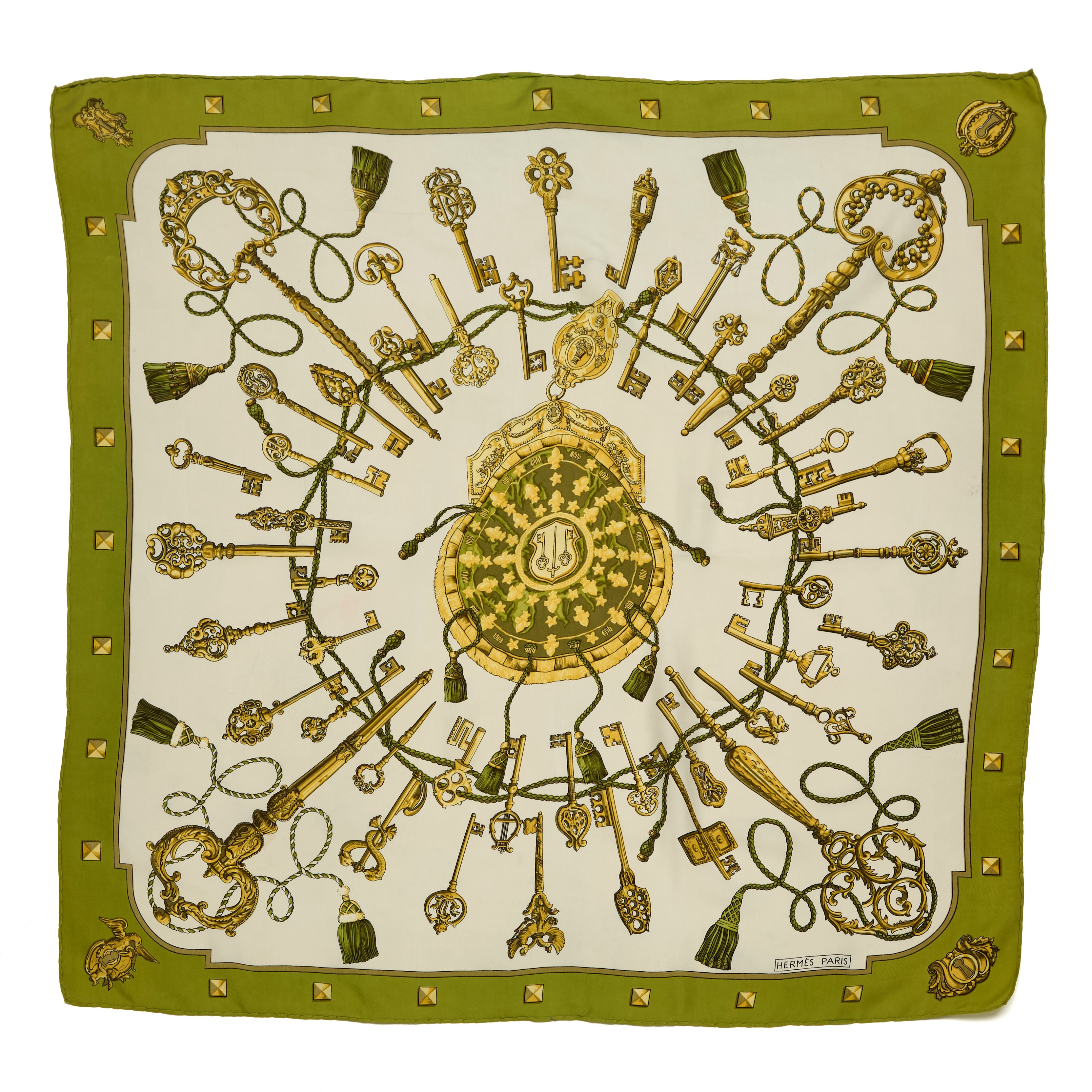 Foulard vintage Hermès in seta "Les Clés" disegnato da Caty Latham, 1965. Condizioni molto buone.