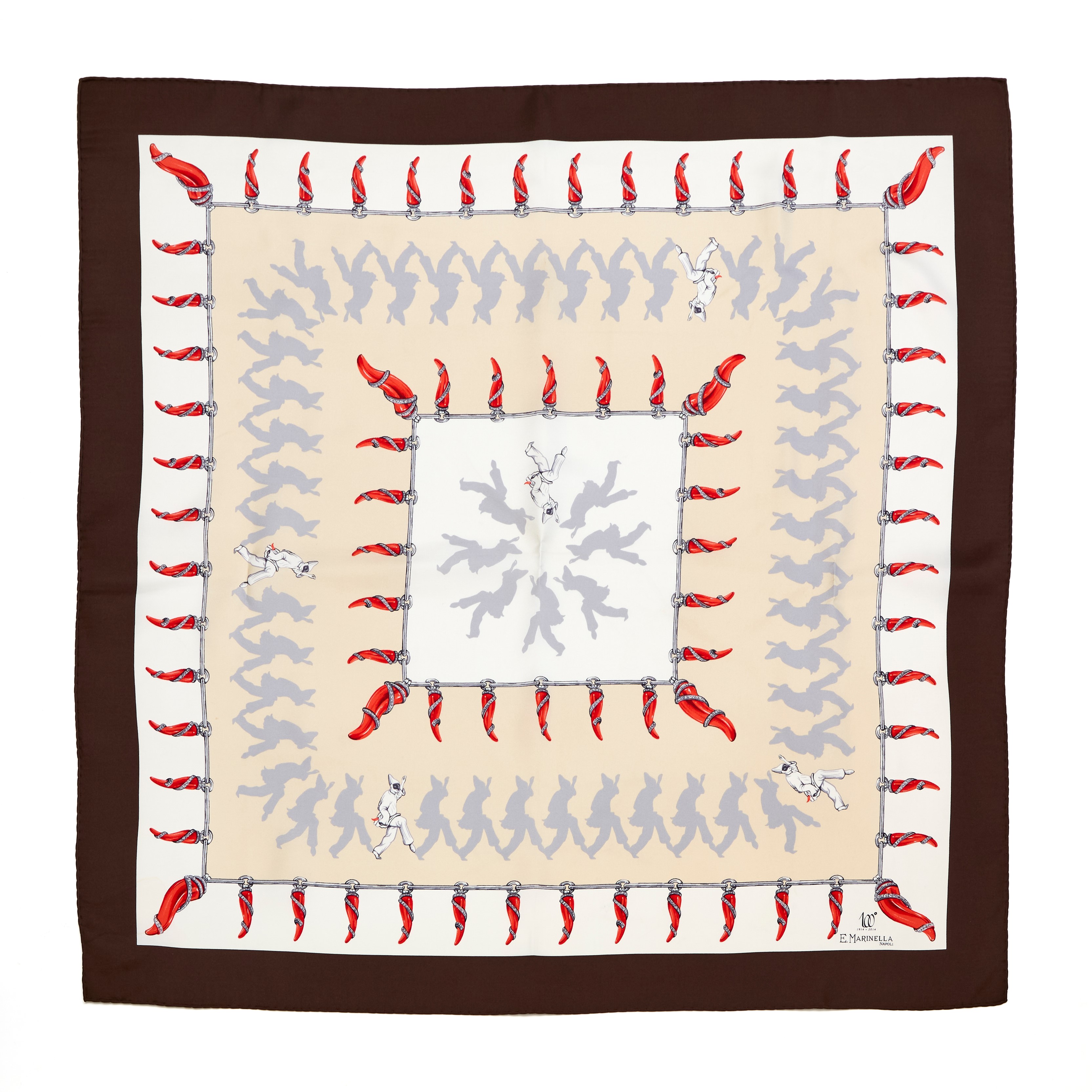 Foulard in seta E. Marinella "Pulcinella Portafortuna" raffigurante Pulcinella e cornini. Realizzato nel 2014 per celebrare il 100° anniversario della Maison. Ottime condizioni.