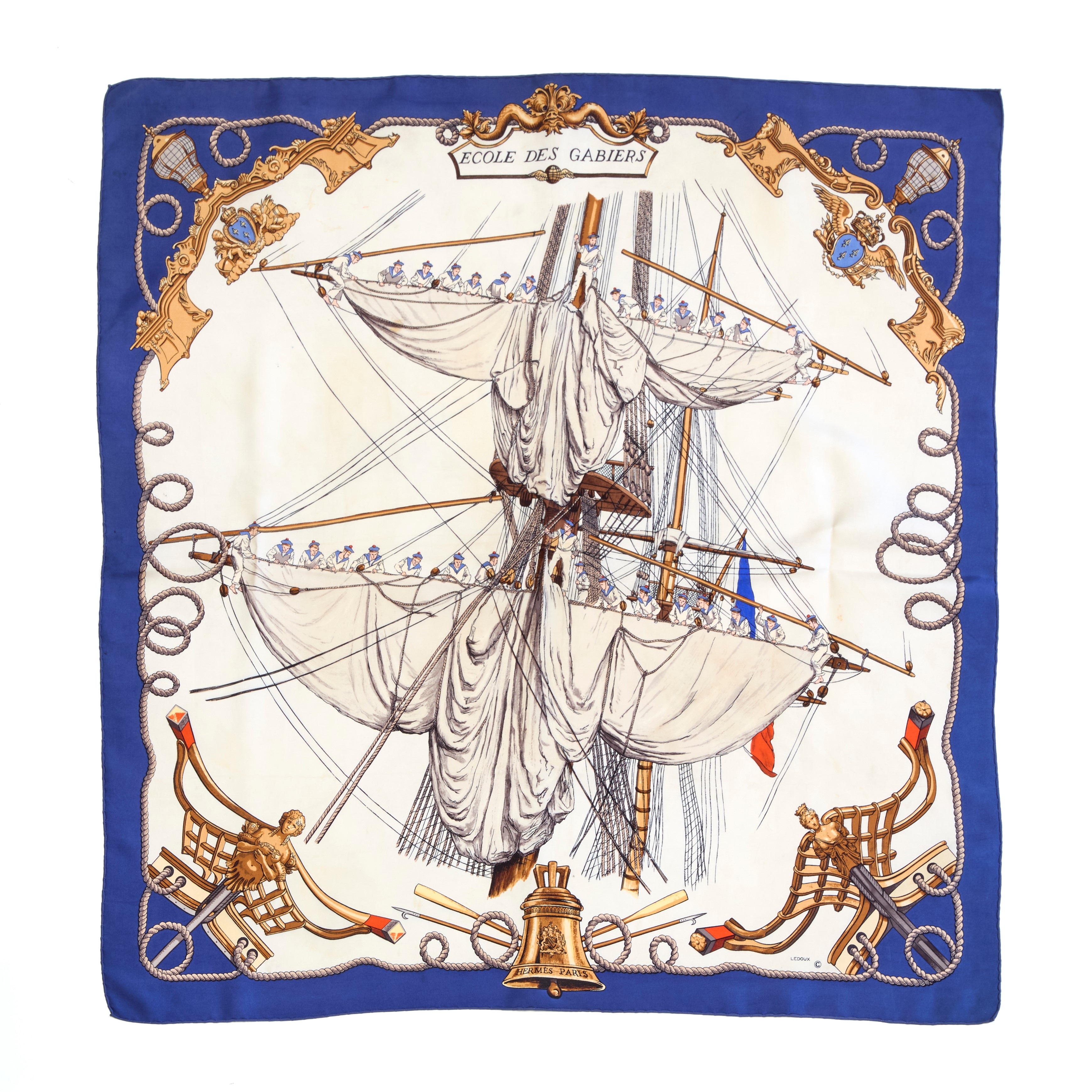 Foulard Hermès vintage "École des gabiers" in seta disegnato da Philippe Ledoux, 1961. Discrete condizioni.