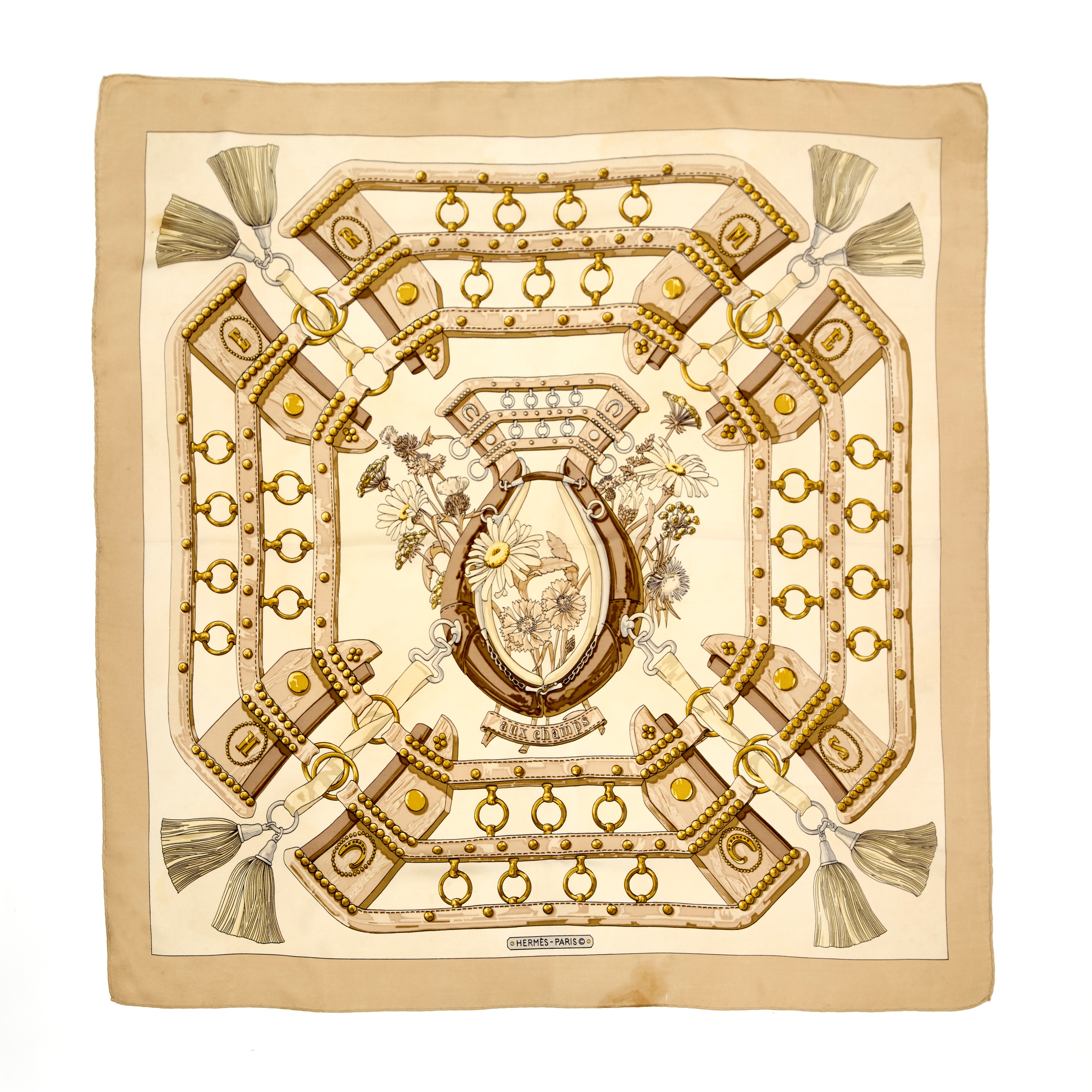 Foulard Hermès vintage "Aux champs" in seta disegnato da Caty Latham, 1970. Discrete condizioni.