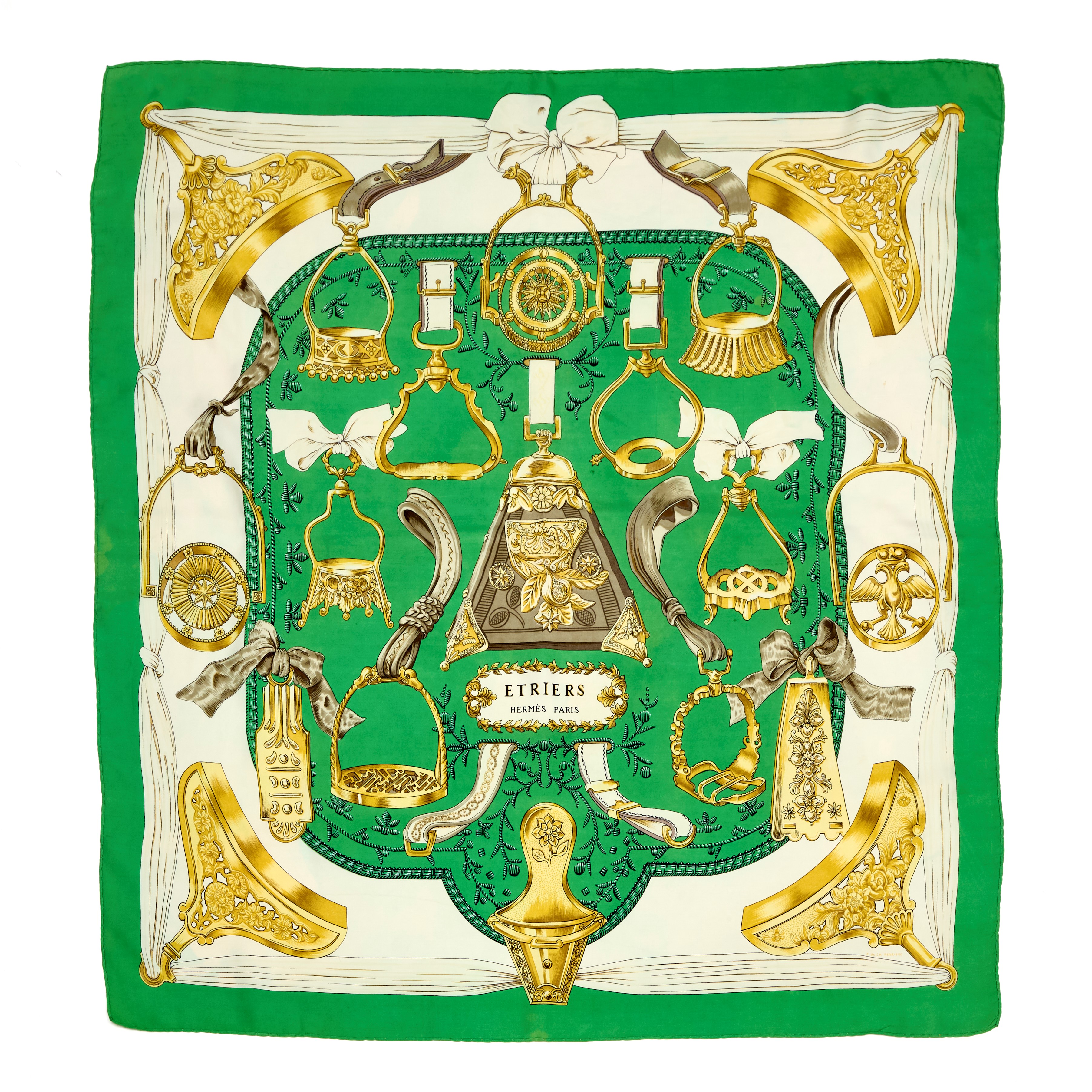 Foulard Hermès vintage "Etriers" in seta disegnato da Françoise de la Perrière, 1964. Discrete condizioni.