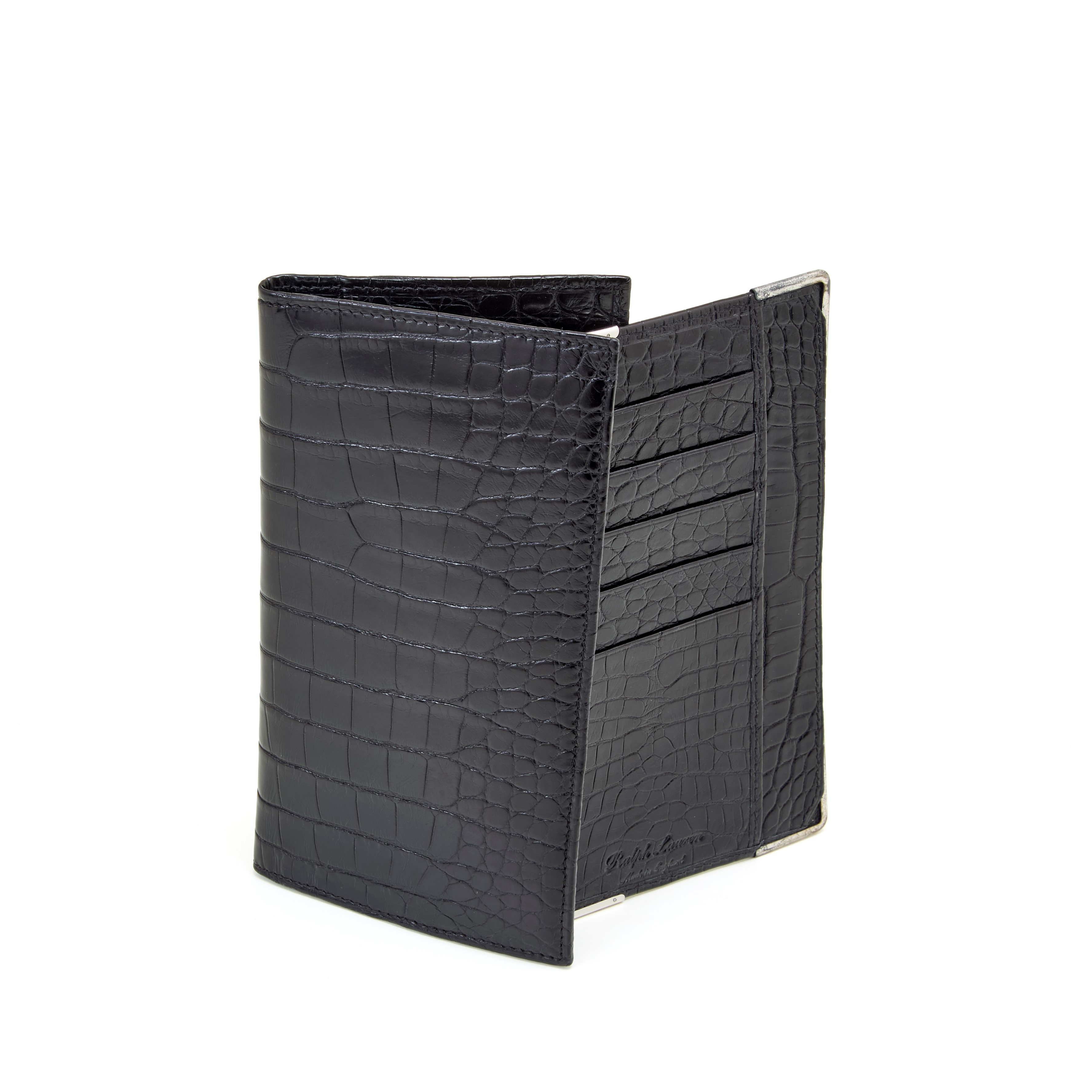 Portafoglio Ralph Lauren in coccodrillo nero con portacarte amovibile, finiture interne in raso viola. Buone condizioni.