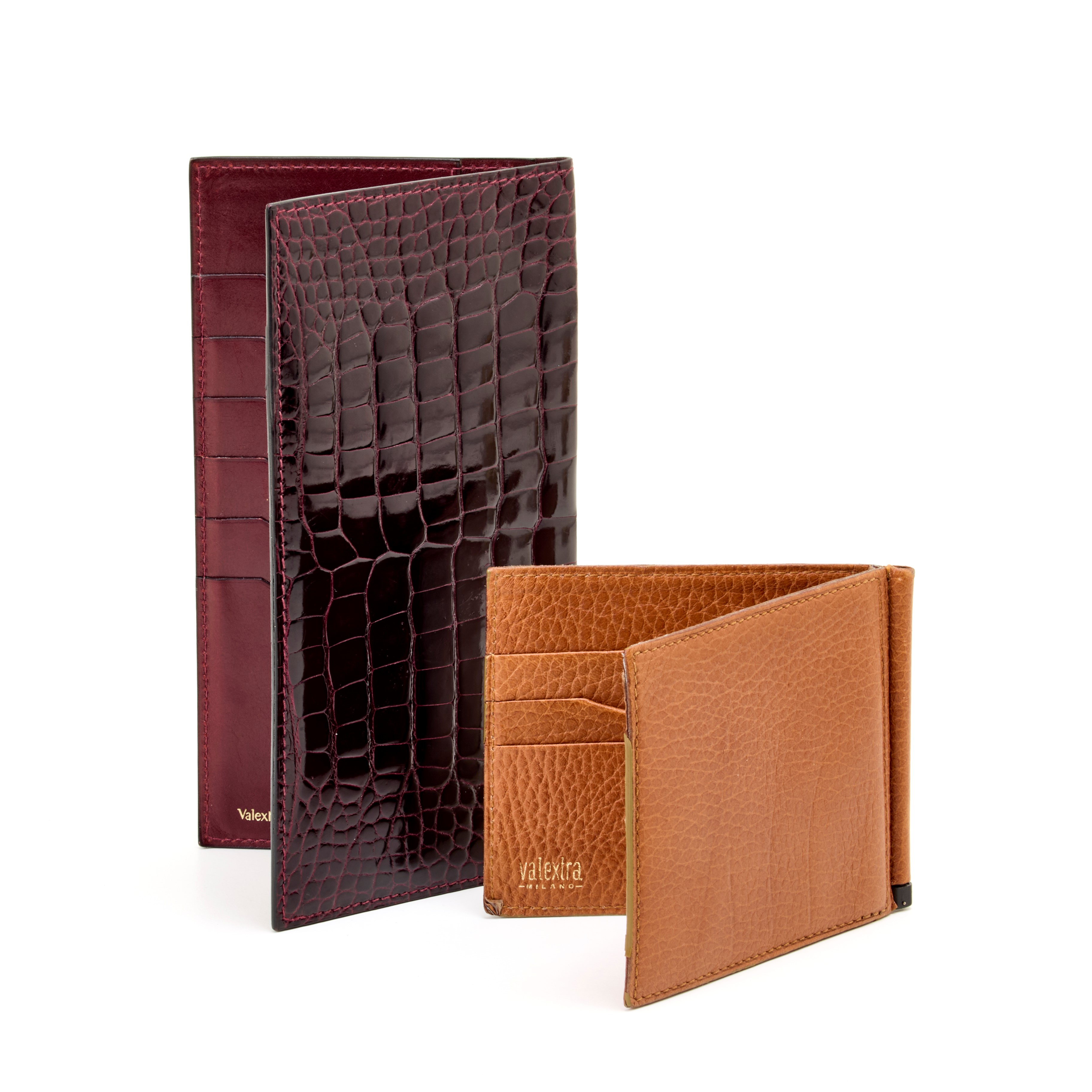 Lotto composto da due portafogli Valextra, uno in coccodrillo e l'altro in pelle. Condizioni molto buone per quello in coccodrillo, discrete per quello in pelle.