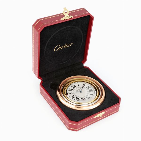 Orologio da viaggio Cartier Trinity. Movimento al quarzo. Cassa, quadrante e movimento firmati. Ottime condizioni (con dedica). Corredato di astuccio originale. Pila nuova.