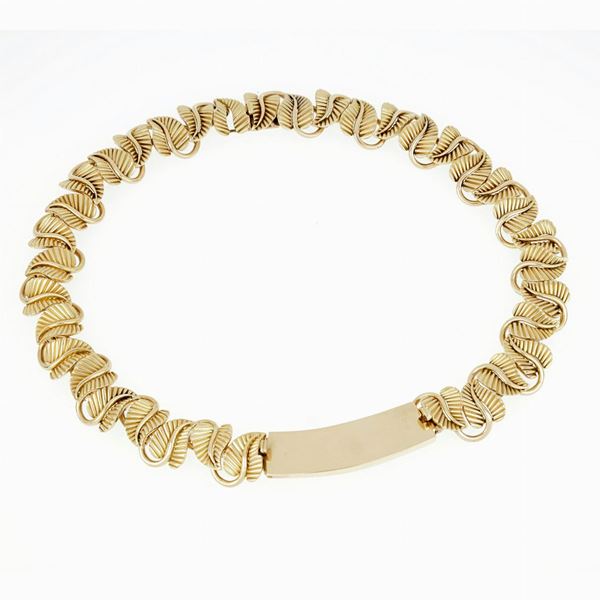 Coppia bracciali anni '50/'60, componibili in un girocollo, in oro giallo 18 Kt.