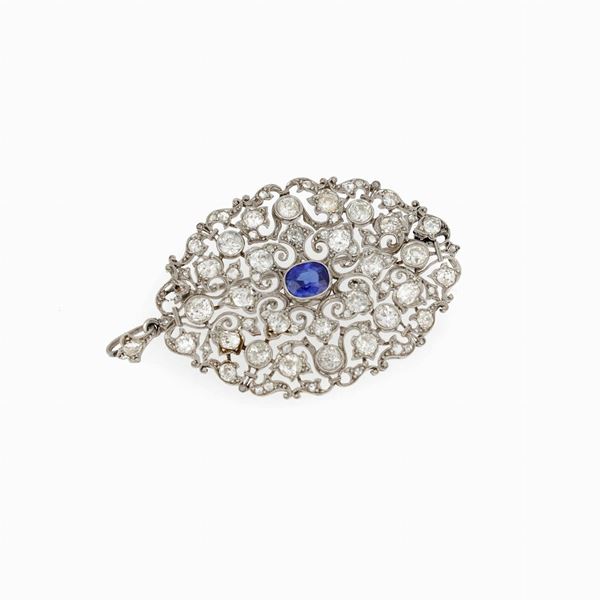 Spilla/pendente in platino con diamanti per complessivi ct. 5.20 circa e uno zaffiro ovale di ct. 1.20 circa.Con catenina in metallo