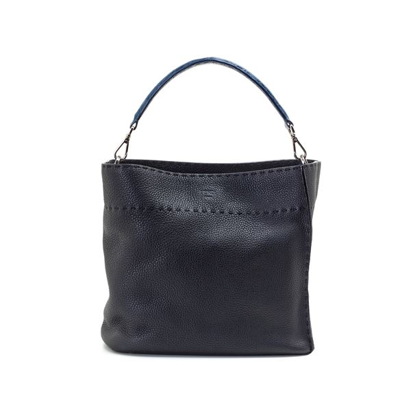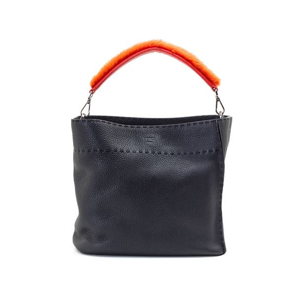 Secchiello Anna Fendi Selleria serie numerata in pelle e metalleria argentata con tre manici intercambiabili in pelle nera, pelliccia arancio e coccodrillo blu, interno in camoscio. Completa di dustbag originale. Come nuova.