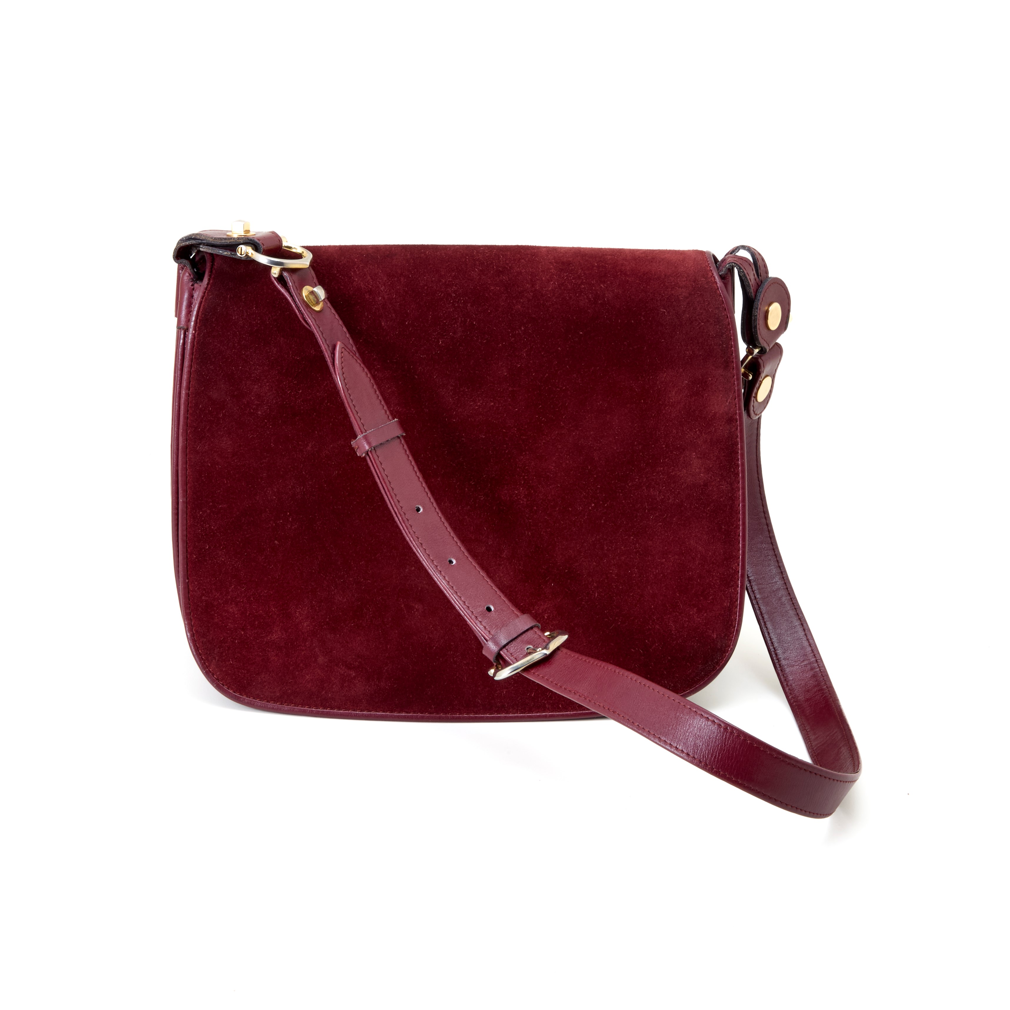 Les Must de Cartier Carnassière shoulder bag in burgundy leather and suede with golden metal hardware. Double interior leather compartment with pen holder. Original dustbag and box included. Fair conditions.