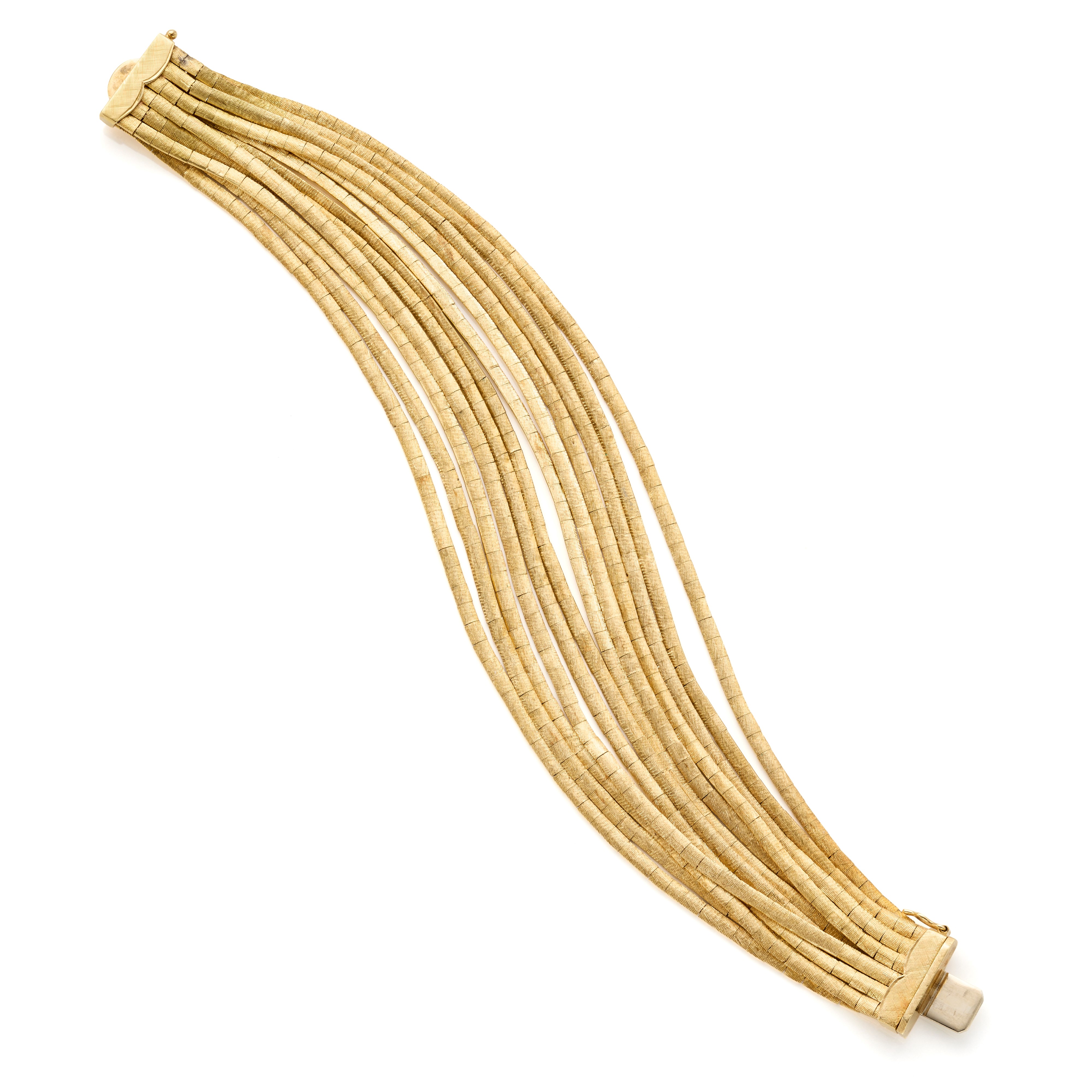 18 Kt satin-finish yellow gold multi-strand bracelet.